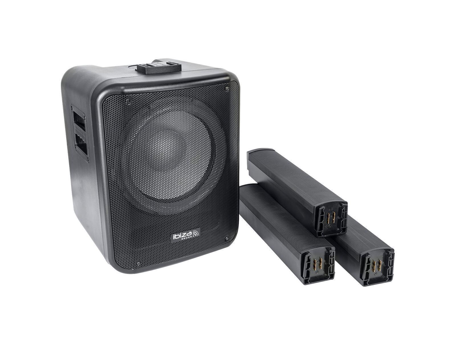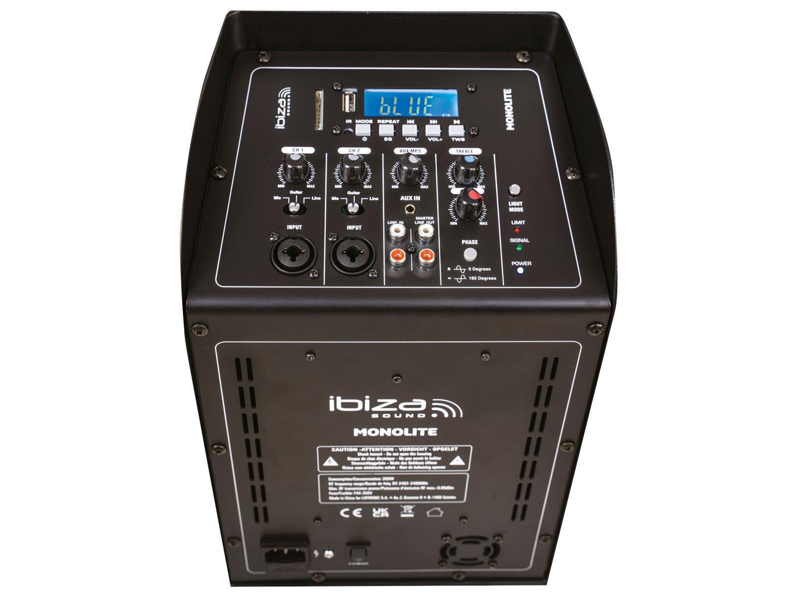 • Ein 30cm Subwoofer • Ein Satellit mit 4x 2.75'' Neodymlautsprechern • Zwei Abschnitte mit Lichteffekten • Verstärkerklasse D • Eingänge: 2x 6.35 Klinke/XLR Combos für Instrument oder Mikro & 1x Line über Cinch • Multimedia Konnektivität: Bluetooth, USB, SD mit Display • Line Ausgang über Cinch • Phasenumkehrung • 2-Band EQ • Mehrere Lichteffekteinstellungen und AUS • Ausgangsleistung: 350W RMS /700W max/1000W Spitze • Tieftöner: 12''/30cm • Gewicht: 19kg • Sicherung: T4A 250V • Schwingspule: 65,5mm • SPL max.: 126dB • Frequenzbereich: 45Hz – 20kHz • Versorgungsspannung: 230V~ 50Hz • Verbrauch: 350W • Abmessungen des Subwoofers: 42x37x49cm • Satellitenabmessungen: 9,6x8,2x46cm (x3) • Bluetooth-Frequenzband: 2402-2480MHz • Max. HF-Sendeleistung BT: 3.44dBm