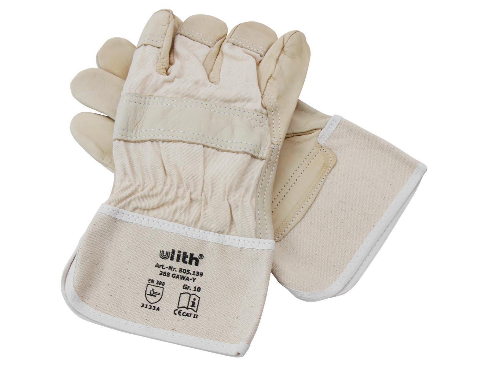 • Arbeitshandschuhe aus beigen Rindvollleder • doppelte Nähte • Zeigefinger ganz aus Leder • weißer 10 Unzen Canvasrücken- und -sicherheitsstulpe • Gummizug auf dem Handrücken • Knöchel- und Pulsschutz • EN388 Schutz vor mechanischen Risiken (Abrieb-, Schnitt, Reiß- und Durchstichfestigkeit)