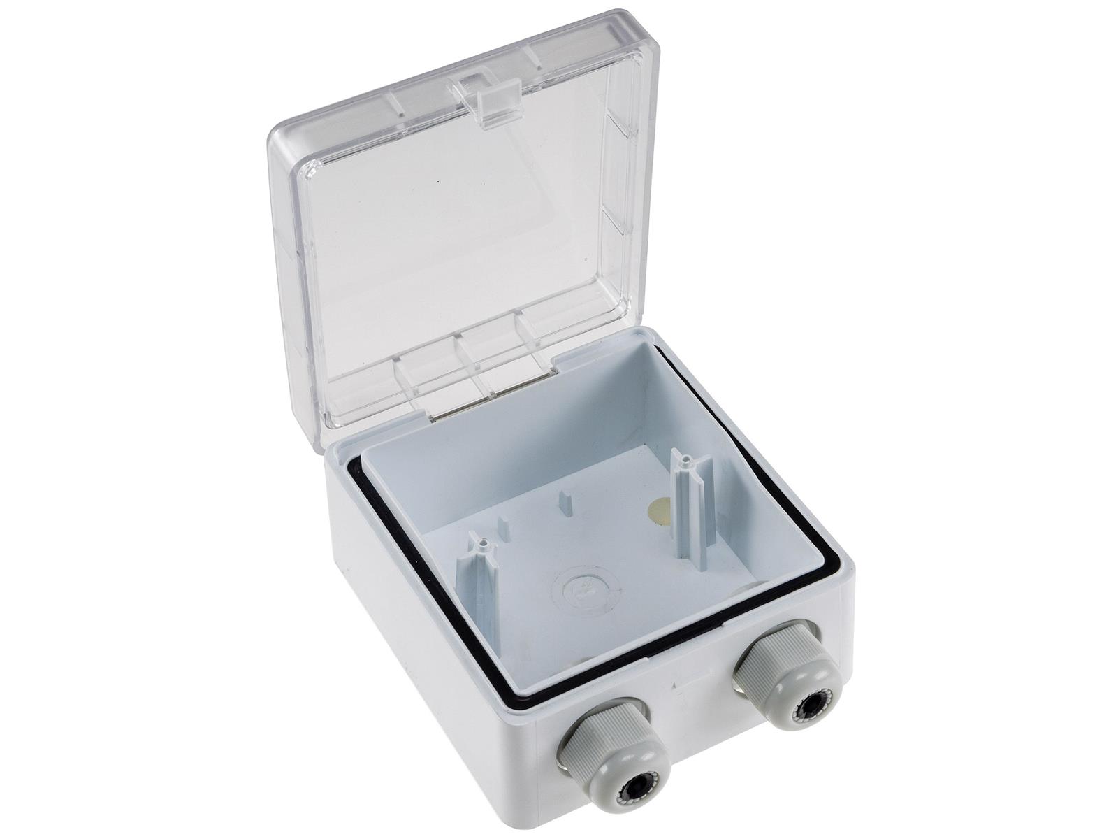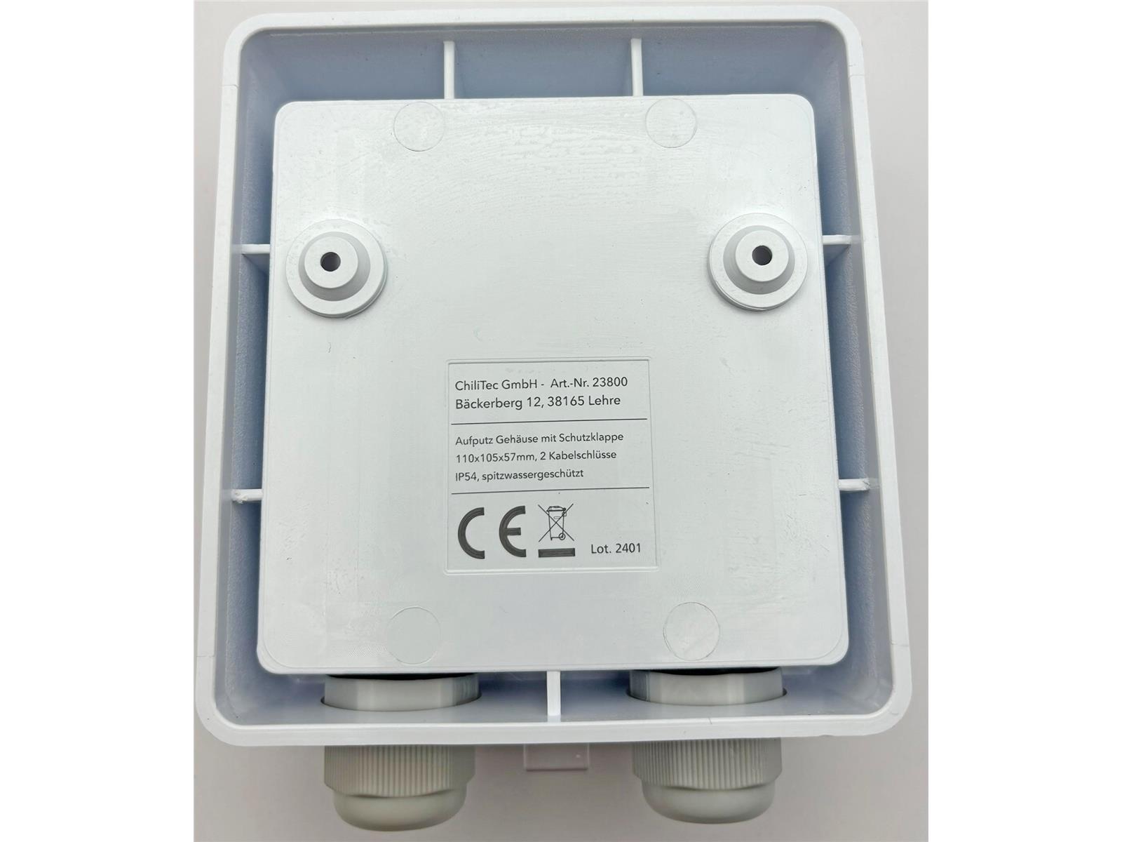 Produktinformationen "Aufputz Gehäuse mit Schutzklappe, IP54 110x105x57mm, 2 Kabelschlüsse"