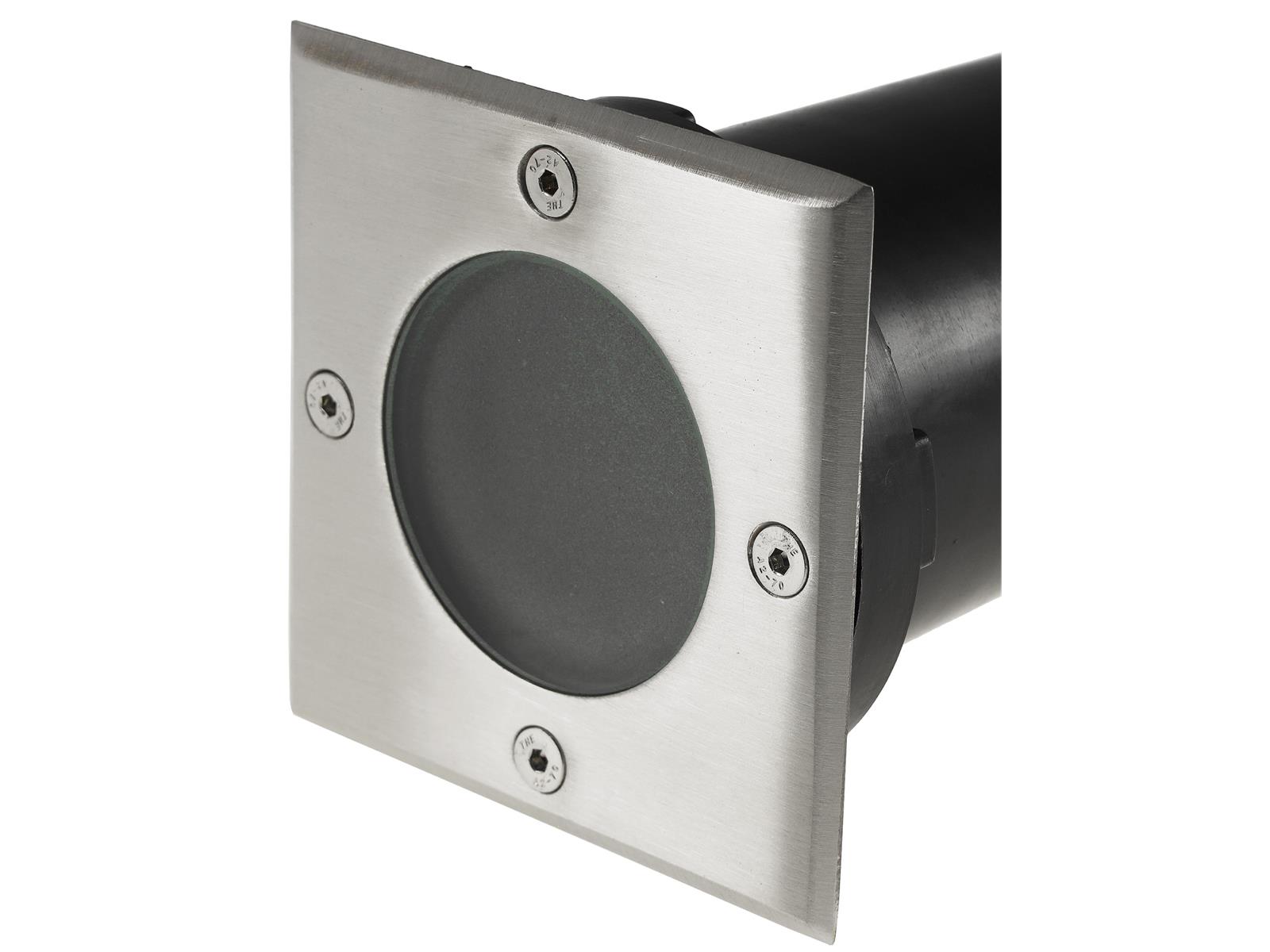 Bodeneinbaustrahler in IP65 schmutz- und wasserfester Ausführung und mit trittfester Edelstahl-Frontplatte und milchiger Verglasung, Universell Ihren Wünschen anzupassen dank GU10-Fassung - so können Sie jede 230V GU10 Lampe bis 35W verwenden!