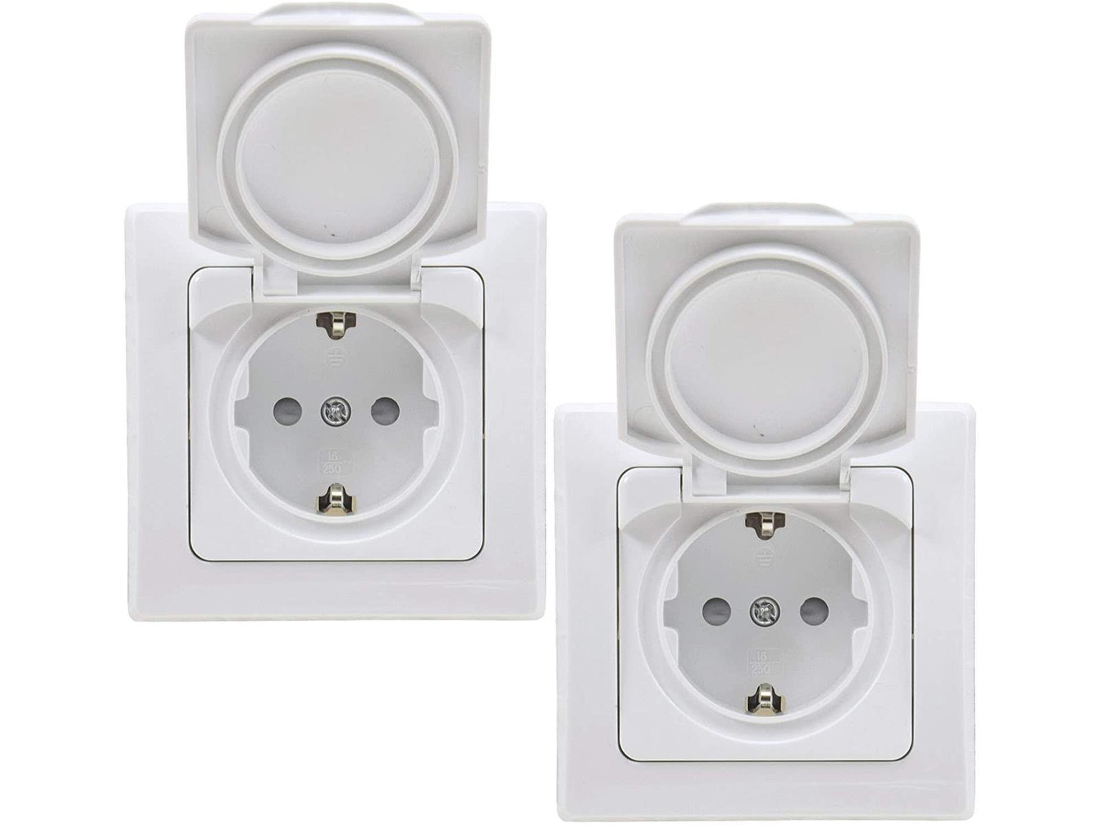 - 2 Stück IP44 Steckdose für Innen, Außen und Feuchträume. Schutz gegen Spritzwasser z.B. im Bad oder Küche und ideal mit Schutzdeckel gegen Dreck in der Werkstatt.