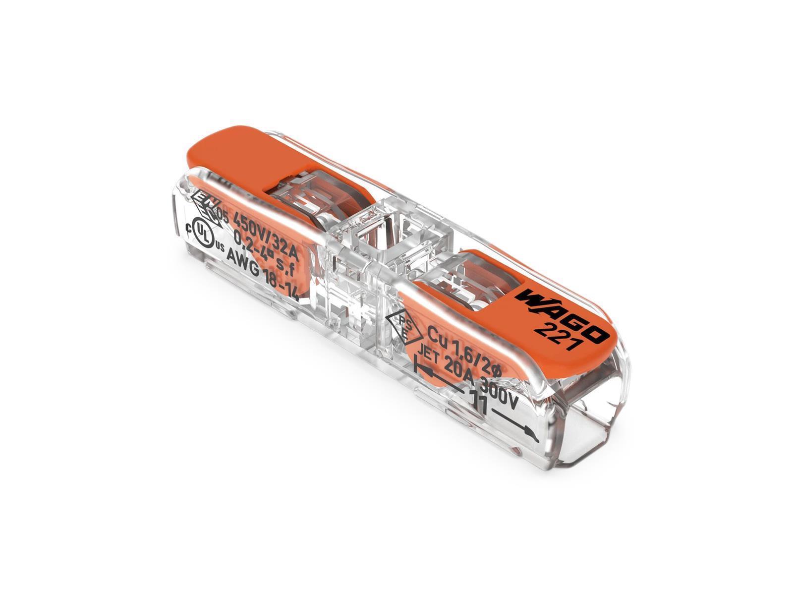 • WAGO Art-Nr. 221-2411 • Bemessungsspannung: 450V • Bemessungsstrom: 32A • Anzahl Klemmstellen: 2 • Maße: 8,1x8,9x35x5mm • Anschluss ein-, fein- und mehrdrähtiger Leiter von 0,2 bis 4 mm² in Durchgangsrichtung • Minimaler Platzbedarf durch schlanke Maße für beengte Installationsräume • Werkzeugloses Verbinden und Lösen von Leitern dank komfortabler Hebeltechnologie