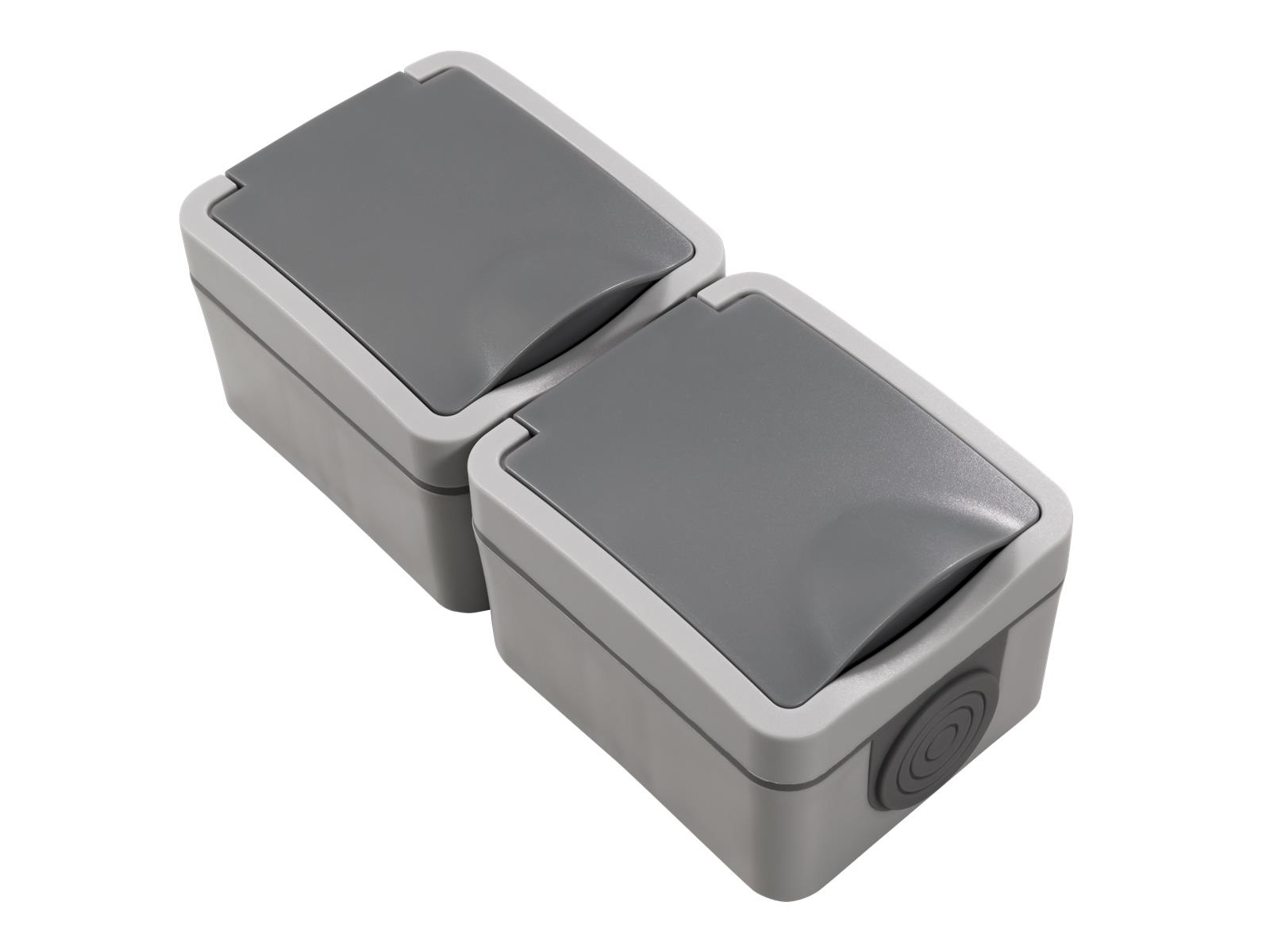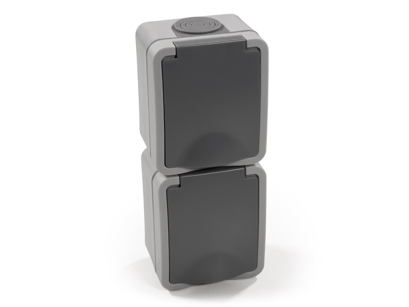 • spritzwassergeschützte Aufputz-Doppelsteckdose • Schutzklasse IP44 • 250V~/16A • mit Einsteckschutz / Shutter • Steckanschluss• Steckdosen vertikal • Farbe: grau • Abmessungen: 152mm x 62,5mm x 52mm