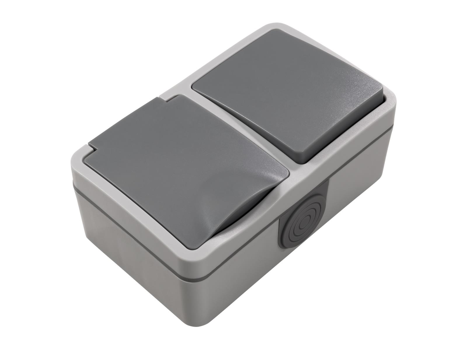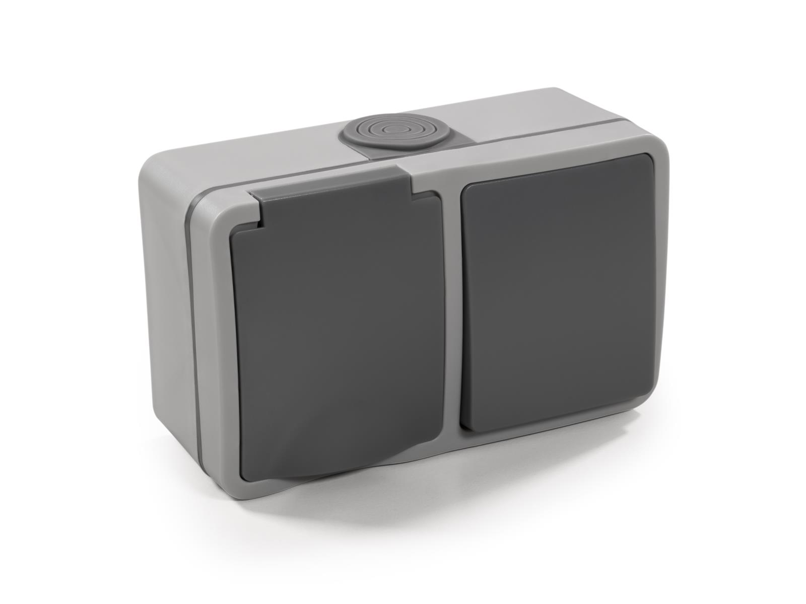 • spritzwassergeschützte Kombi-Dose • Schutzklasse IP44 • Steckdose 250V~/16A • mit Einsteckschutz / Shutter • Wechselschalter 250V~/10A • Steckanschluss • Schalter + Steckdose horizontal • Farbe: grau • Abmessungen: 75mm x 120mm x 53mm