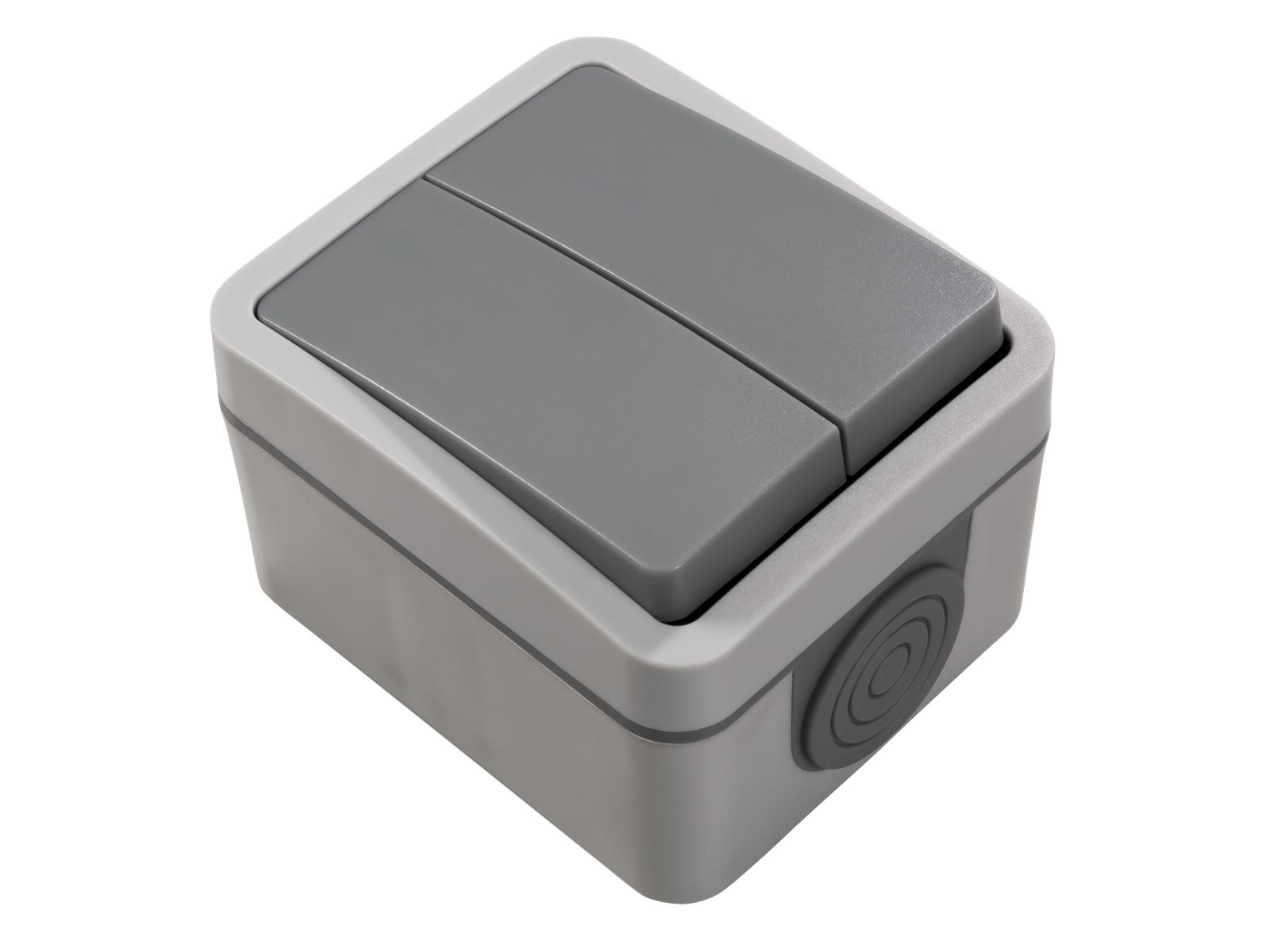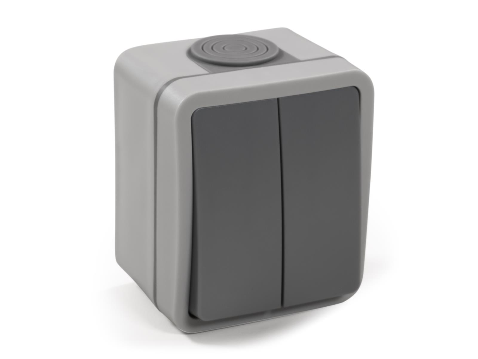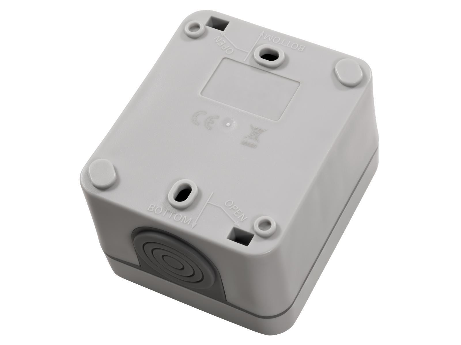 • spritzwassergeschützter Aufputz-Serienschalter • Schutzklasse IP54 • 250V~/10A • Steckanschluss • Farbe: grau • Abmessungen: 75mm x 62,5mm x 53mm
