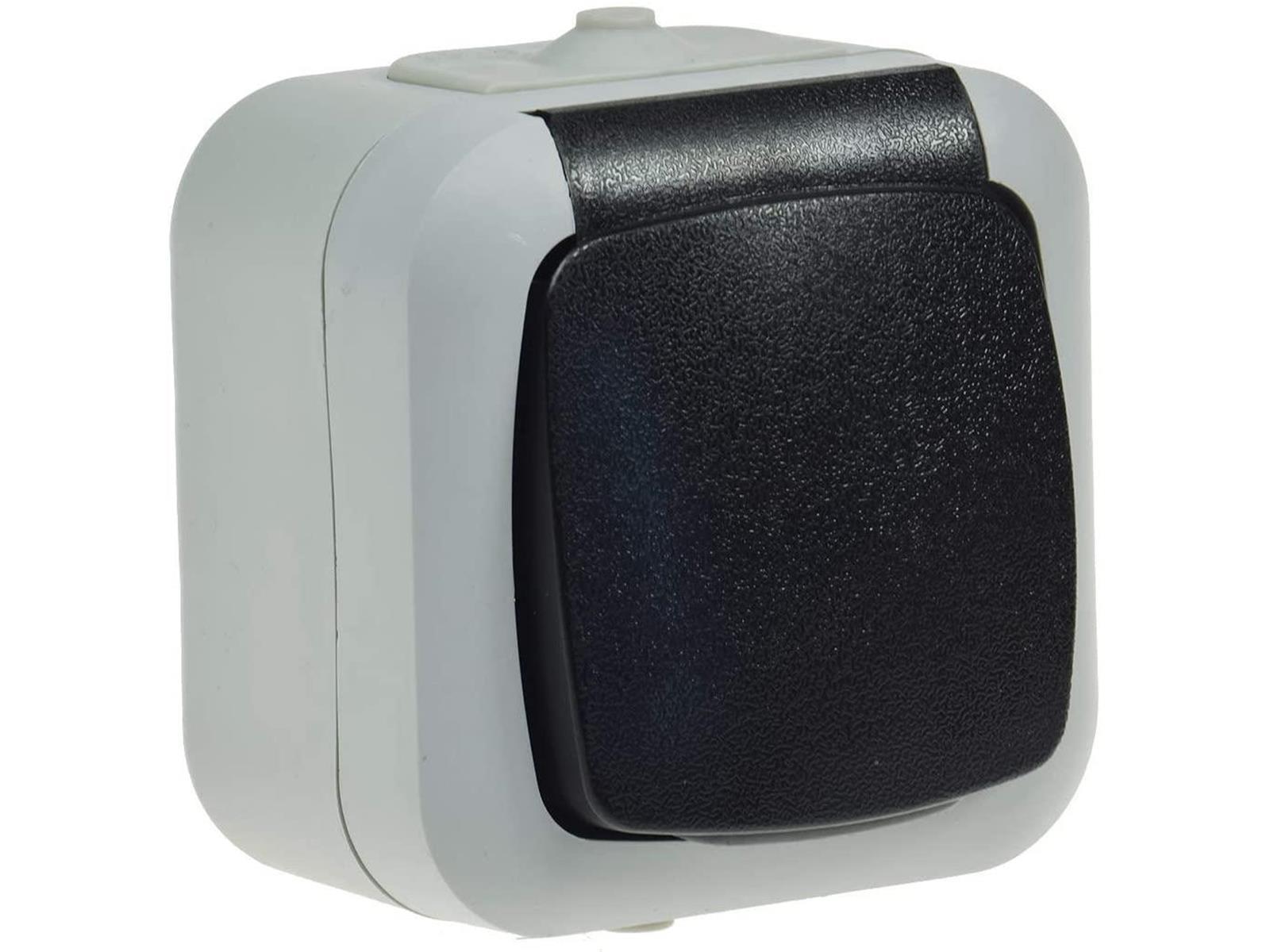 Spritzwassergeschützte Steckdose in Aufputz-Ausführung für 250V/50Hz, max. 16A.Hellgrauer Rahmen mit dunkelgrauem Deckel mit Federschließung.
