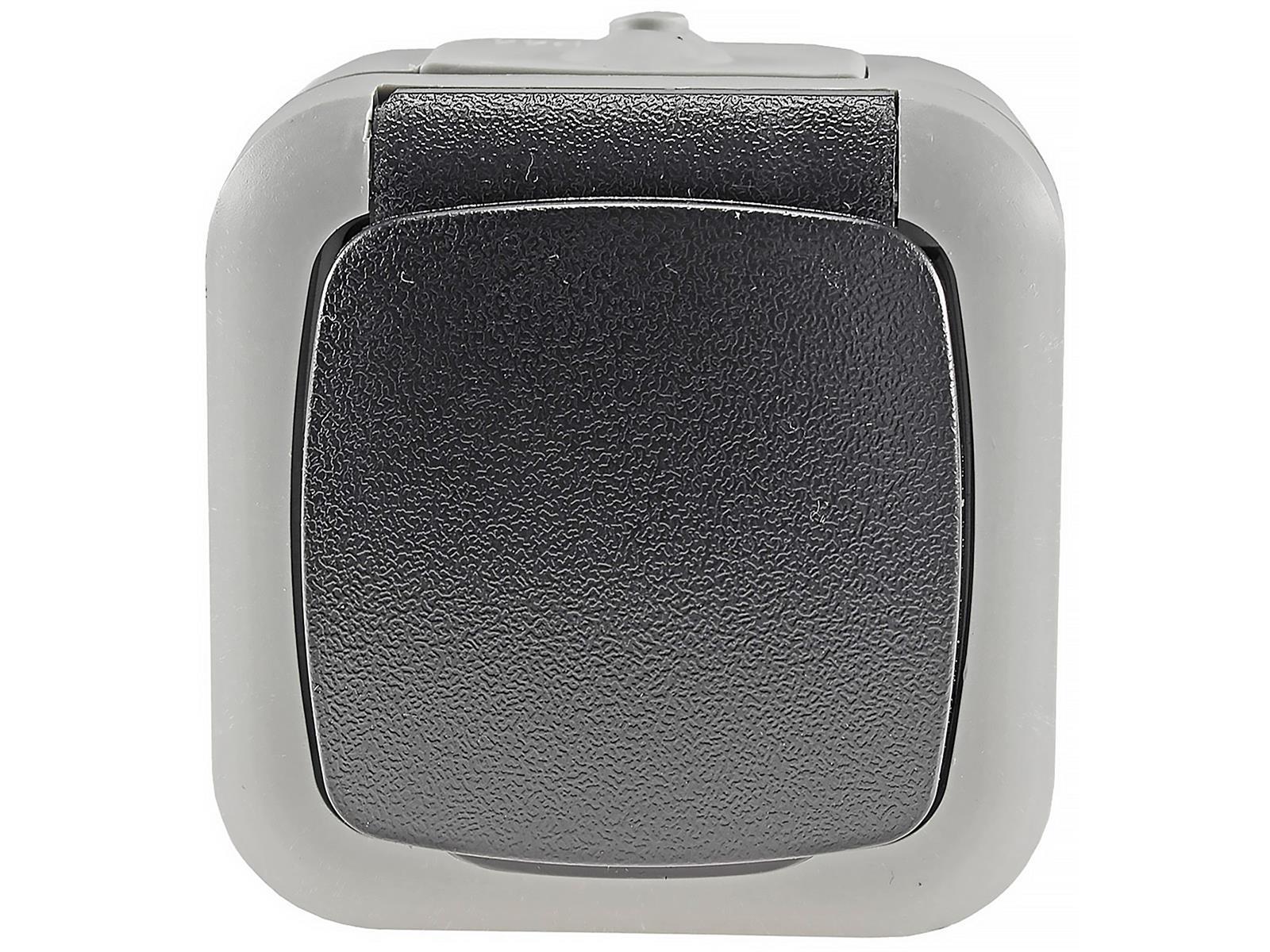 Spritzwassergeschützte Steckdose in Aufputz-Ausführung für 250V/50Hz, max. 16A.Hellgrauer Rahmen mit dunkelgrauem Deckel mit Federschließung.