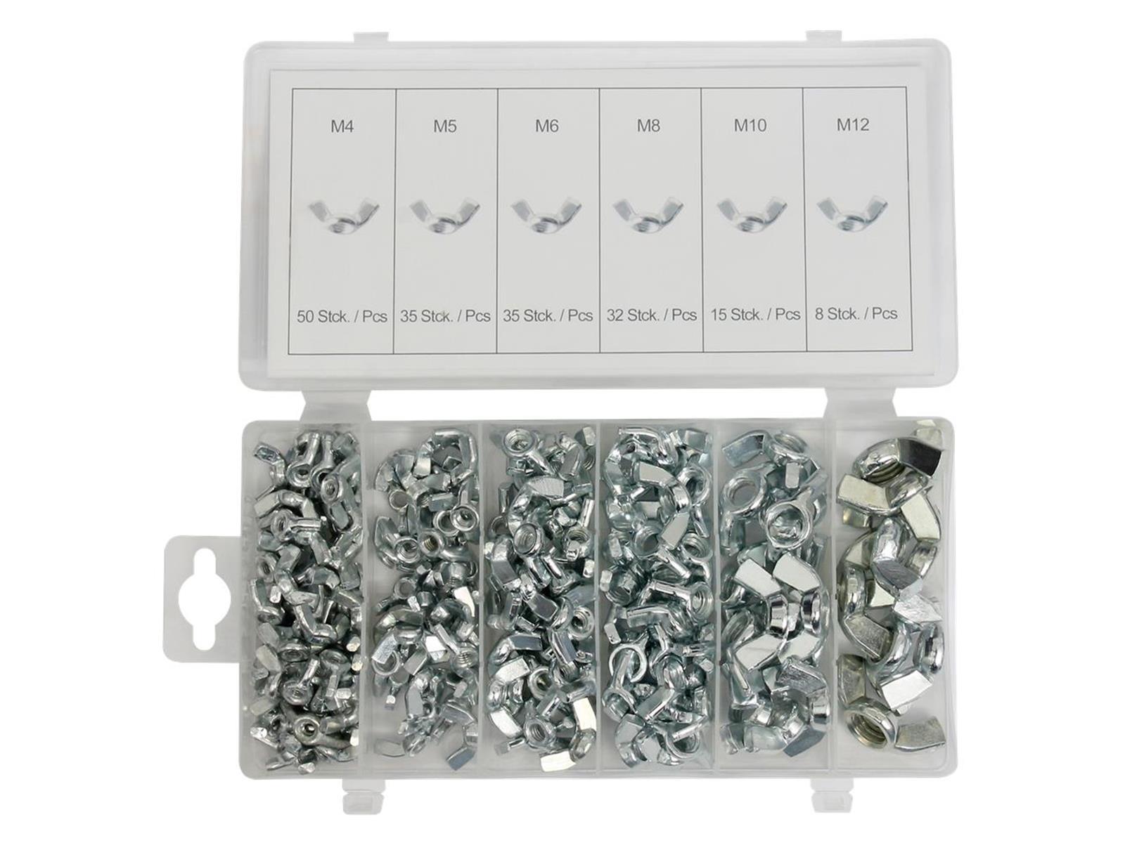 • Flügelmuttern • 175 tlg. • Größen: M4 - 50 Stk.: M5 - 35 Stk.: M6 - 35 Stk.: M8 - 32 Stk.: M10 -15 Stk.: M12 - 8 Stk.