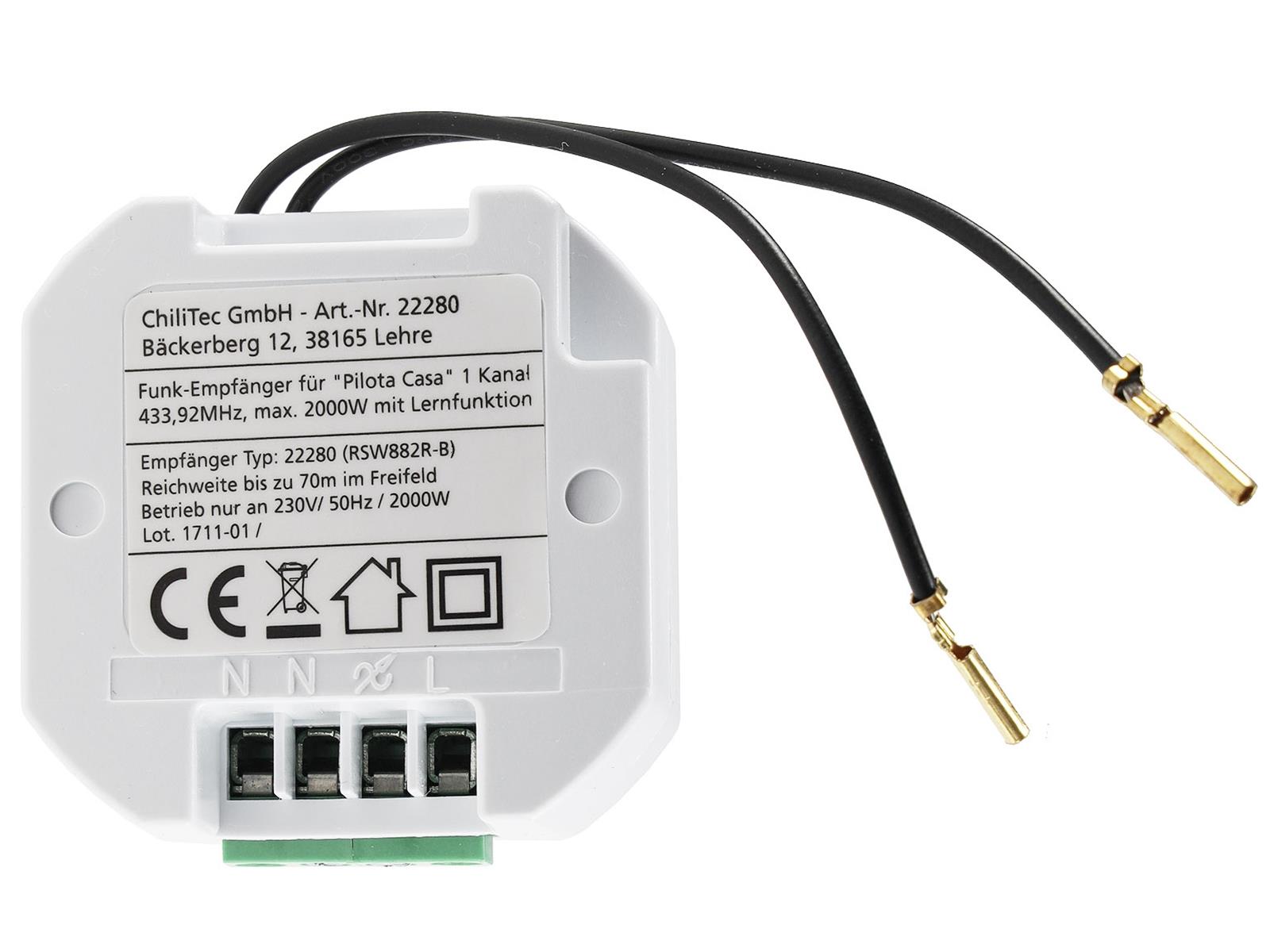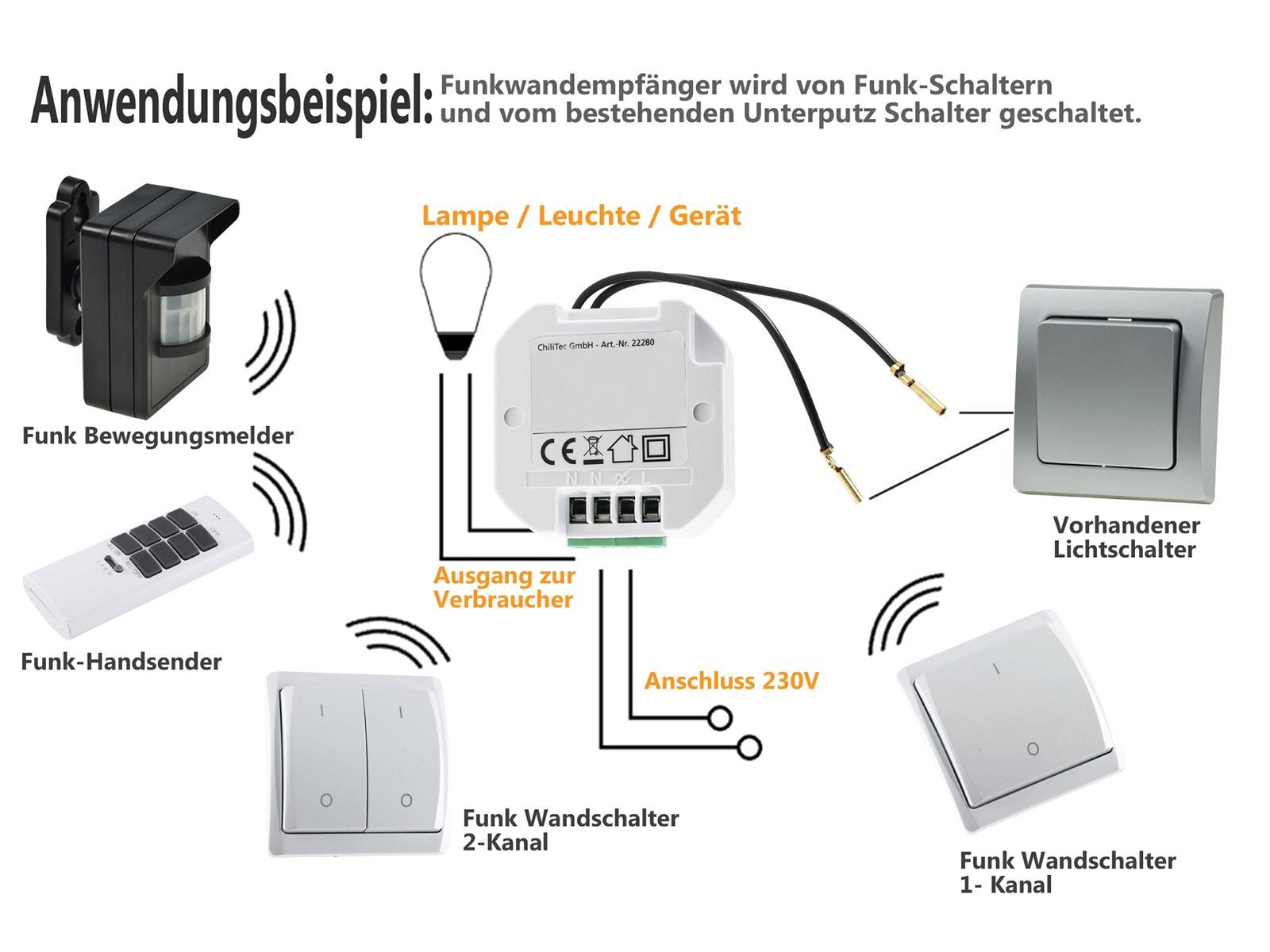Funk Empfänger zum einfachen Nachrüsten für Ihre Lichtschalter. Einfach hinter dem Schalter in der Hohlwanddose anschließen und das lästige Verlegen von Kabeln vermeiden. Dieser Funk Empfänger ermöglicht so den angeschlossenen Leuchten / Lampen eine zusätzliche Schaltung mit einem der Funk-Sender. (Schalter 1-fach / Schalter 2-fach oder Fernbedienung).