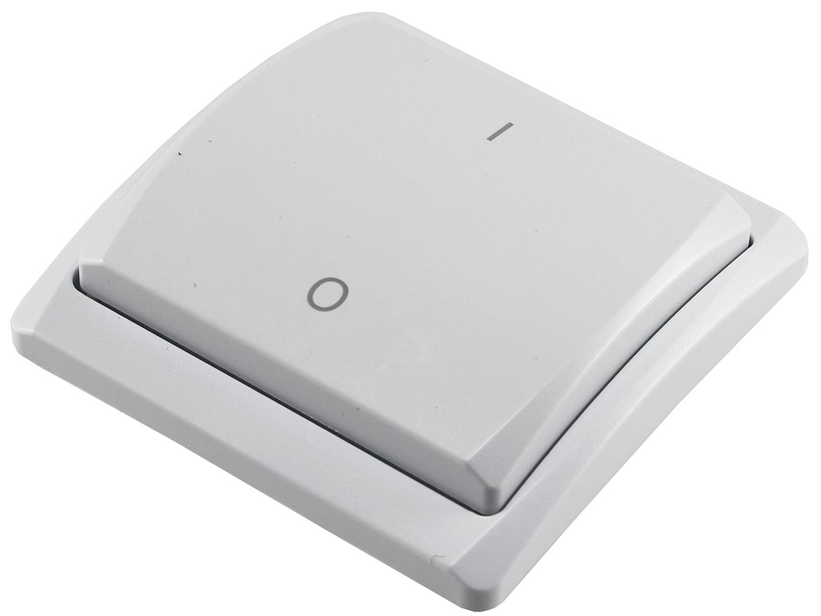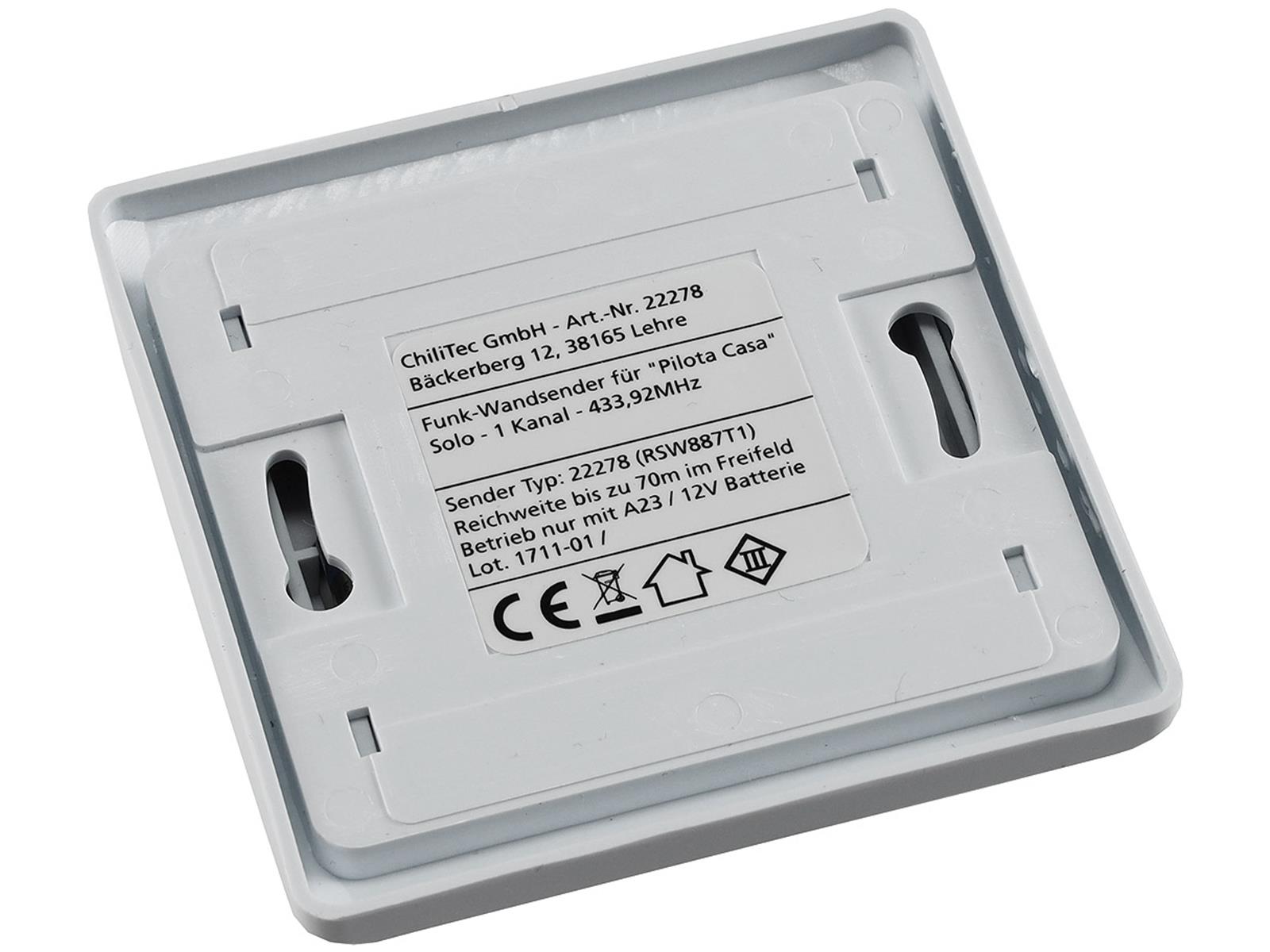 Passender 1-fach Wandsender (Funk-Schalter) für den Funk-Empfänger CT-FR1 . Es ist kein Anschluss via 230V nötig, der Schalter wird über eine A23 Batterie mit Strom versorgt.