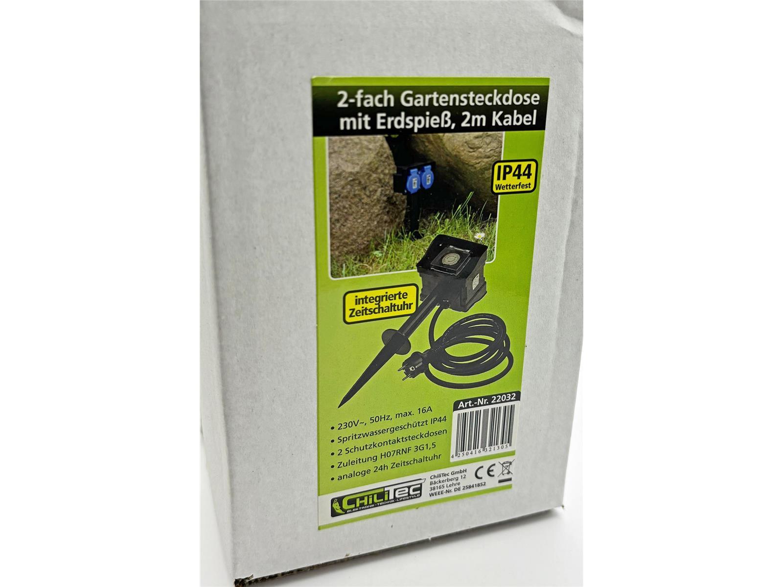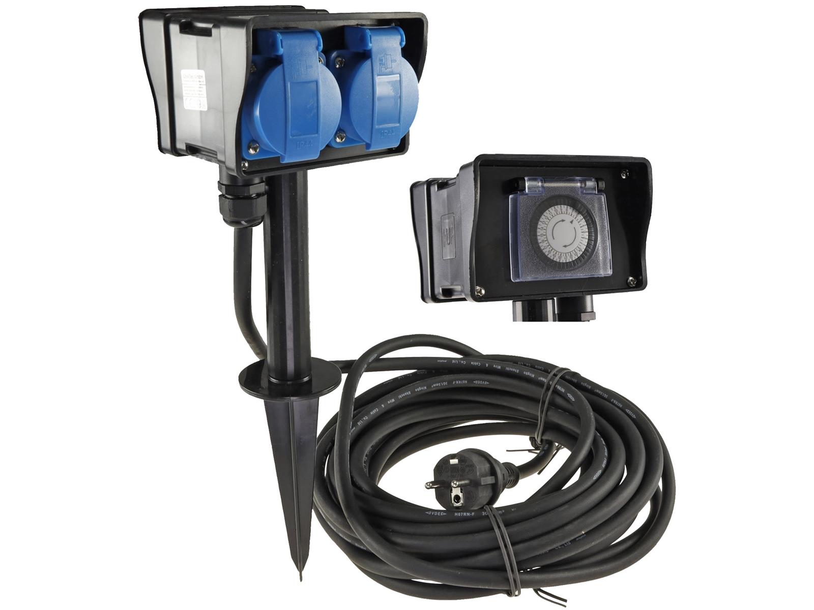 Produktinformationen "Gartensteckdose mit Erdspieß, 2-fachIP44, 2m Kabel, Zeitschaltuhr"