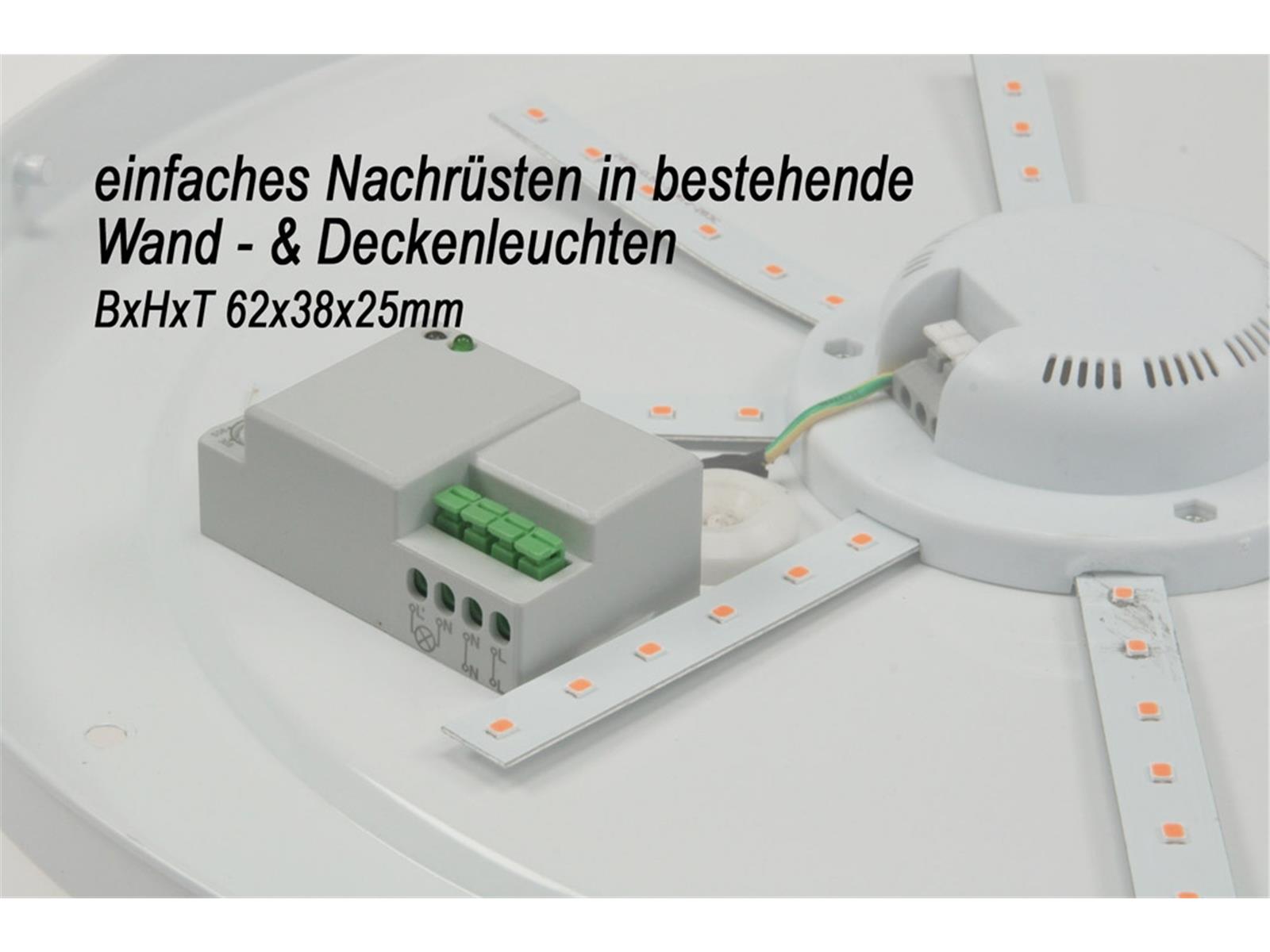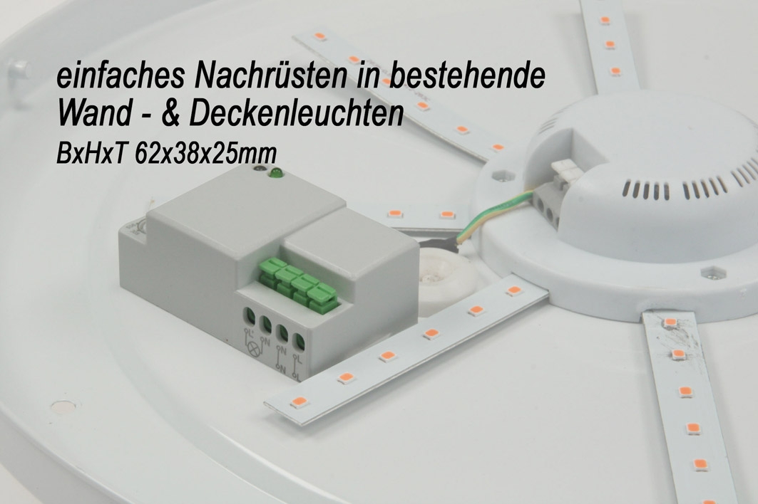 Verleihen Sie Ihrer normale Wand- oder Deckenleuchte Topkomfort: Dieser Melder kann in bestehende Leuchten eingebaut werden, damit diese zukünftig vollautomatisch einschalten, sobald jemand den Raum betritt! Ideal für Flure, Keller, Terrassen etc