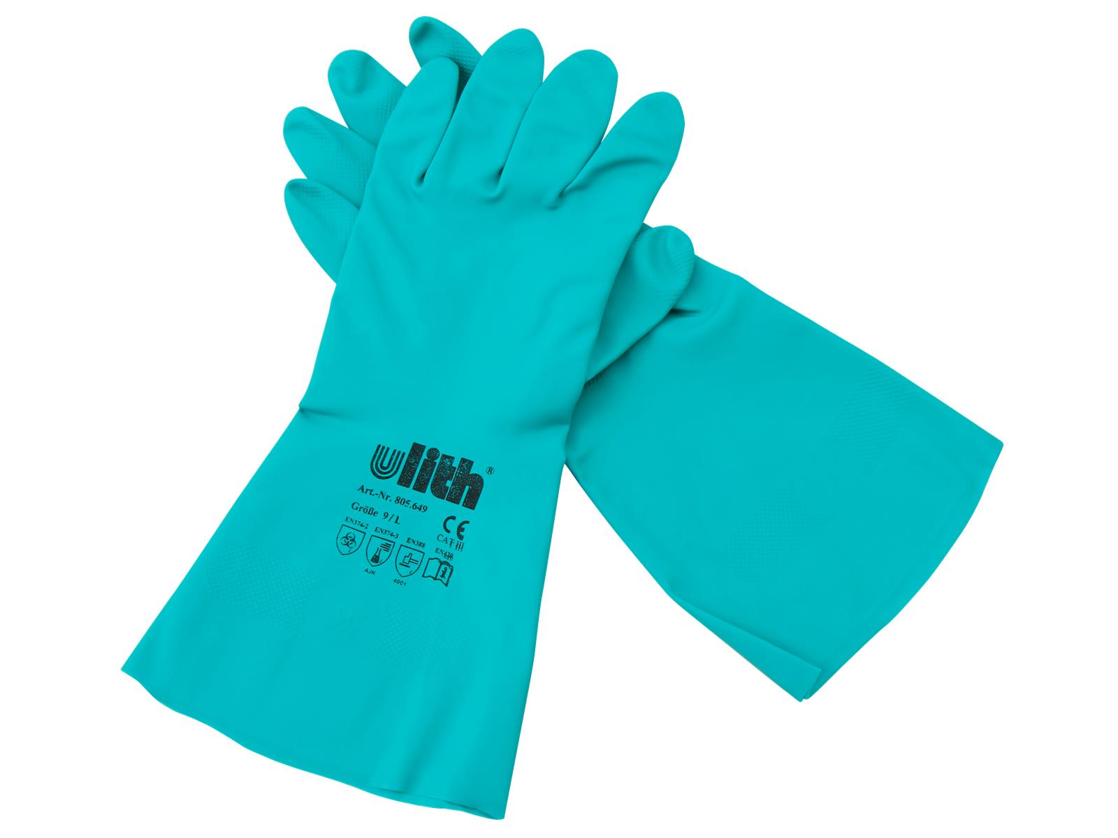 • Haushalts- u. Industriehandschuhe • Premium Nitril-Kautschuk, • velourisiert • baumwollbeflockt • Rollrand • griffige Handinnenfläche • Nitril-Grün • EN388 Schutz vor mechanischen Risiken (Abrieb-, Schnitt, Reiß- und Durchstichfestigkeit) • EN374-2 Schutz vor Flüssigkeits- und Mikroorganismenpenetration • EN374-3 Schutz vor Chemikalienpermeation • Latex frei