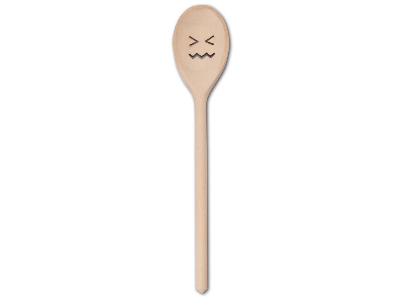 Produktinformationen "Kochlöffel, oval, mit Motiv Gesicht mit zusammengekniffenen Augen, aus Holz 30 cm"