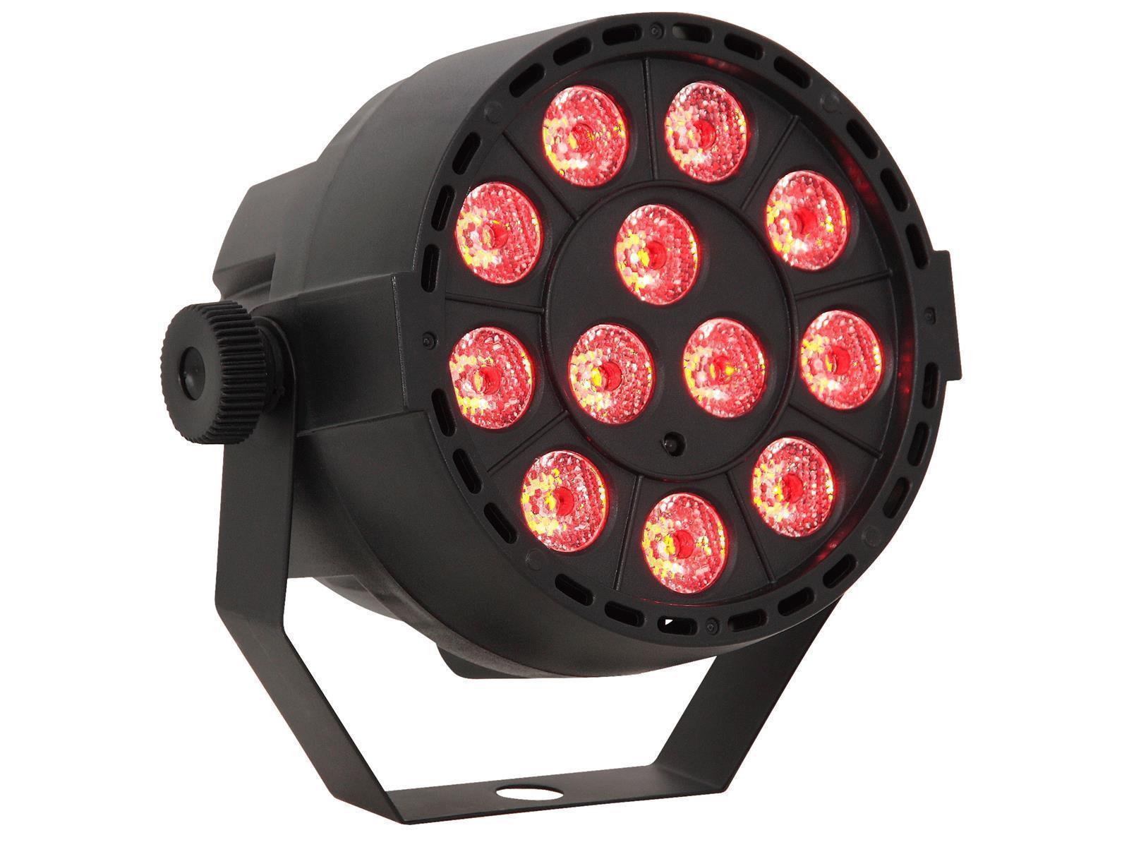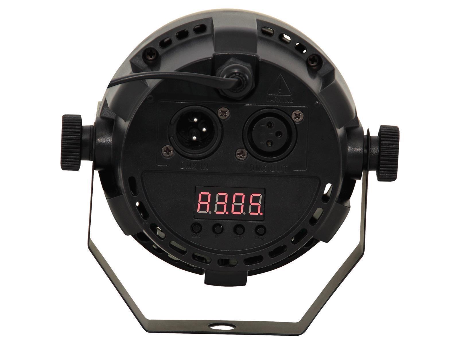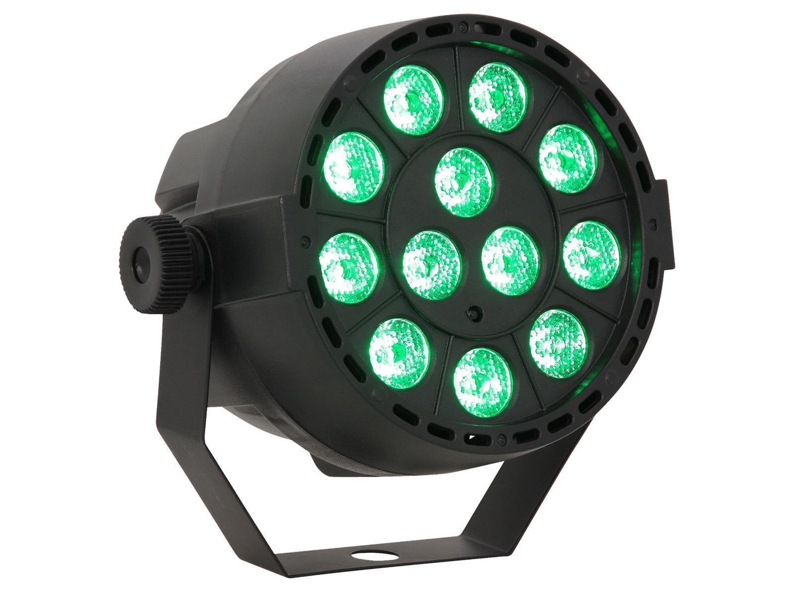 • 7 DMX Kanäle • 12x 3W RGB LEDs • Farbmischer, Dimmer und Strobe • Automatischer, musikgesteuerter, manueller oder DMX gesteuerter Betrieb • Musiksteuerung über Mikrofon • Fernbedienung • schwarzes Metallgehäuse • Verbrauch 40W • Maße 120x120x90mm • Gewicht 0,41kg
