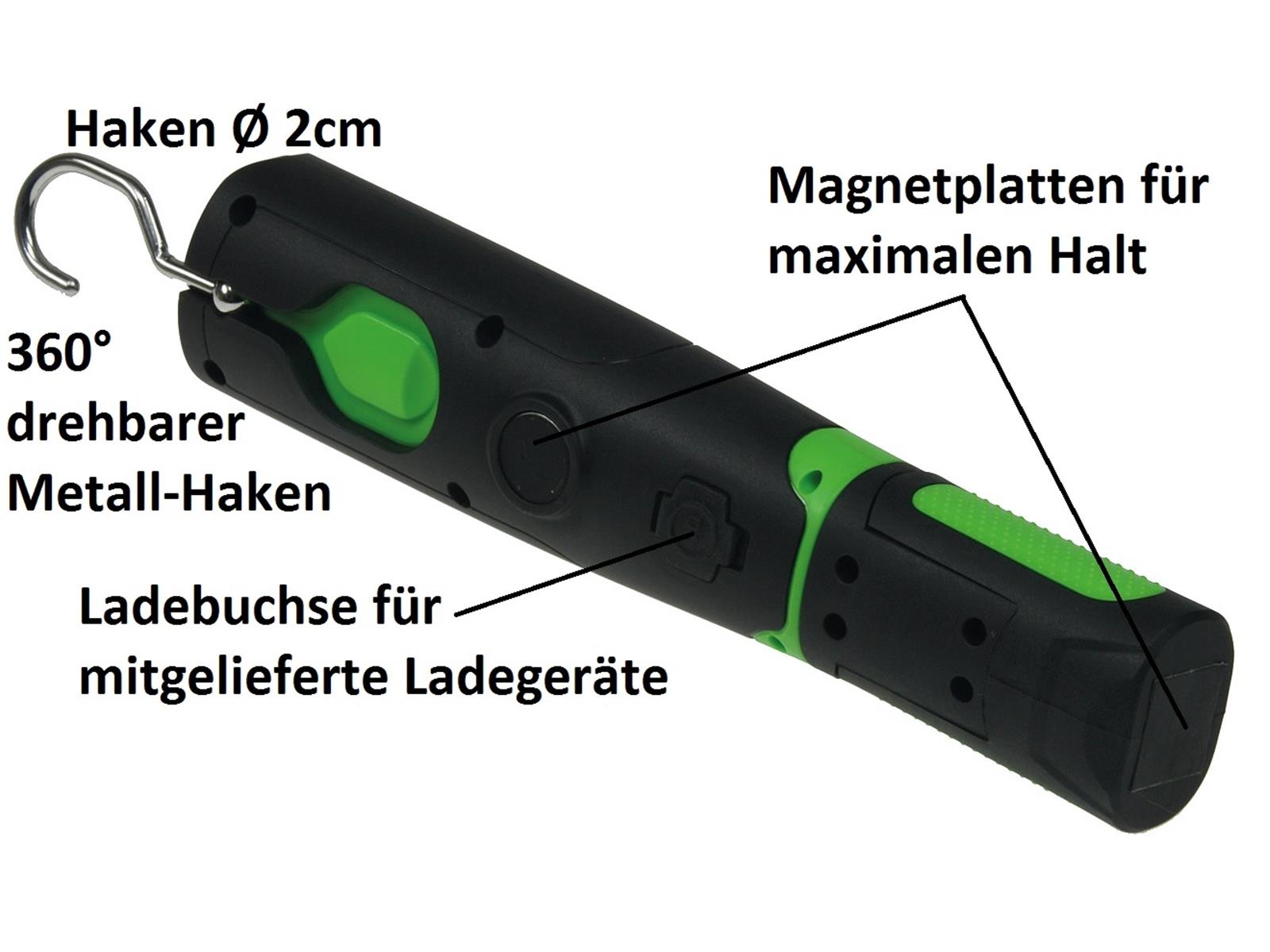 Professionelle, kräftige und höchst flexible LED-Arbeitsleuchte mit Akku, Haken und 2 Magnethaltern.