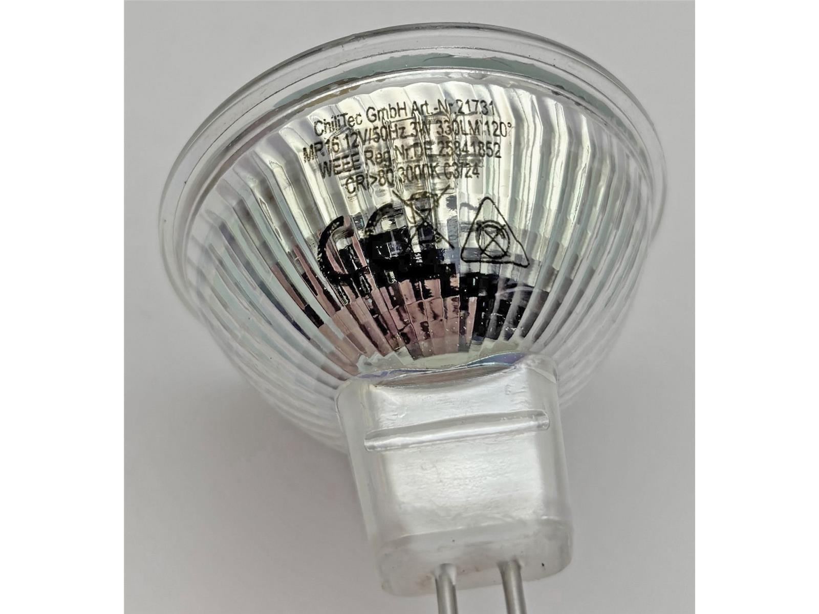 Diese günstige LED Lampe mit ausgereifter Technik ist mit 3W + knapp 300 Lumen eine topp Alternative für 20-35W Halogenlampen! Bei einem Abstrahlwinkel von 120° macht sie eine sehr gute Figur z.B. über Ess- und Wohnzimmertischen. Für den sichern Betrieb dieser MR16 12V Led Strahler empfehlen wir die Verwendung vom passenden LED-Trafo (z.B. Art.Nr. 20934 - 20937).