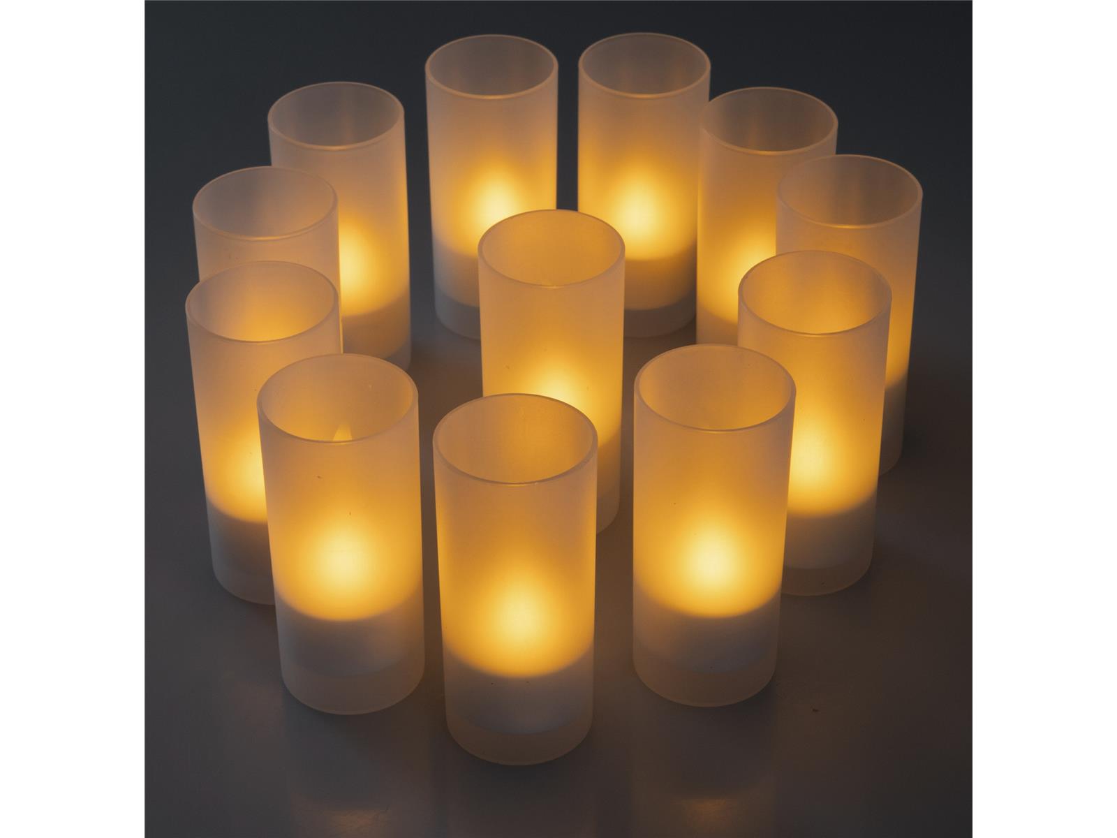 Wunderschöner Flacker-Effekt, fast so als wären die Kerzen echt! Kerzenlicht ohne Wachsflecke oder Feuergefahr. Das Set enthält: 12 wiederaufladbare LED-Teelichter, 12x Windschutz aus gefrostetem Kunststoff (Höhe 10cm), Netzteil und Ladestation.