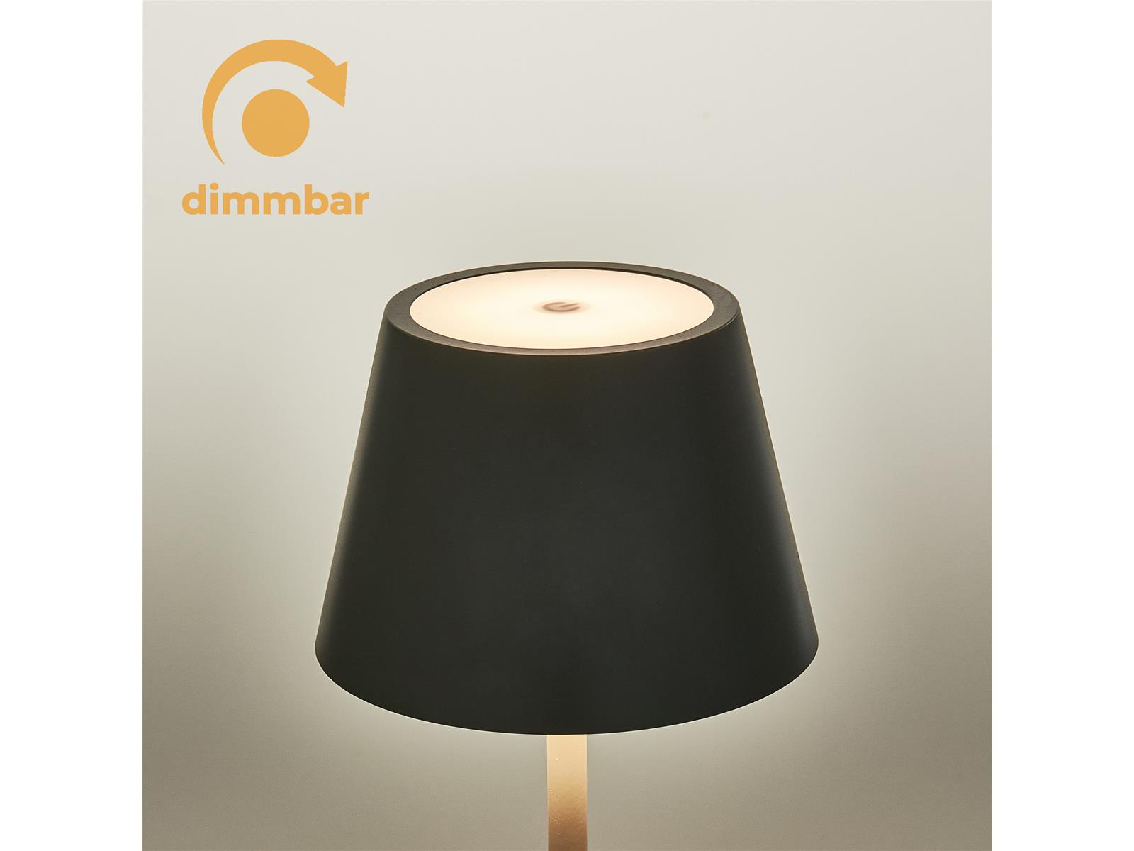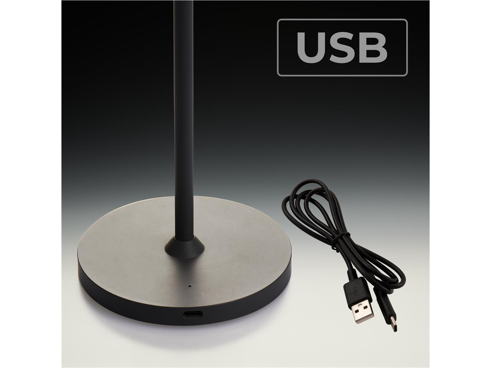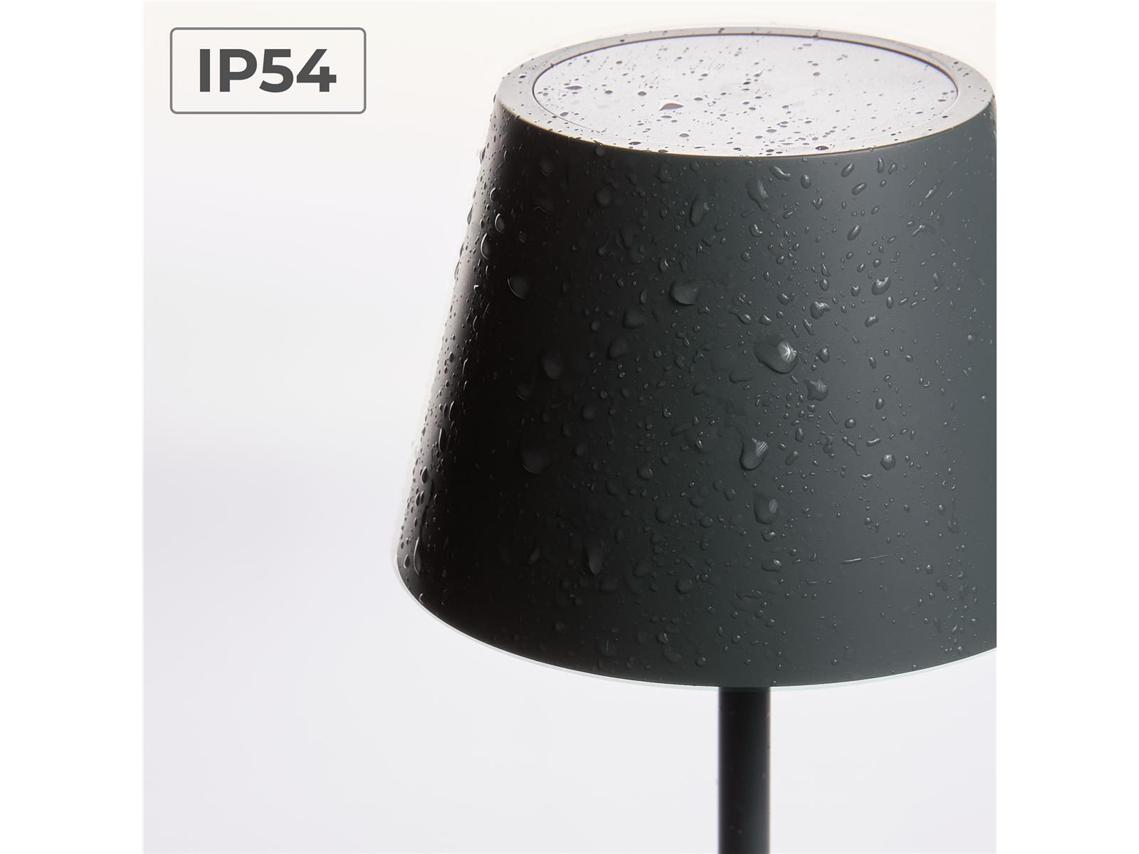 • aufladbare LED-Tischleuchte • stufenlos dimmbar per Touch-Funktion • Leistung 1,2W • Lichtstrom 100lm • Akku-Laufzeit 10-15 Stunden • Ladedauer 8-10 Stunden • Farbetemperatur 2700K • Schutzklasse IP54 • Farbwiedergabeindex Ra>95 • 2200mAh Li-Ion Akku • inkl. USB-Ladekabel • Maße ØxH 10x38cm