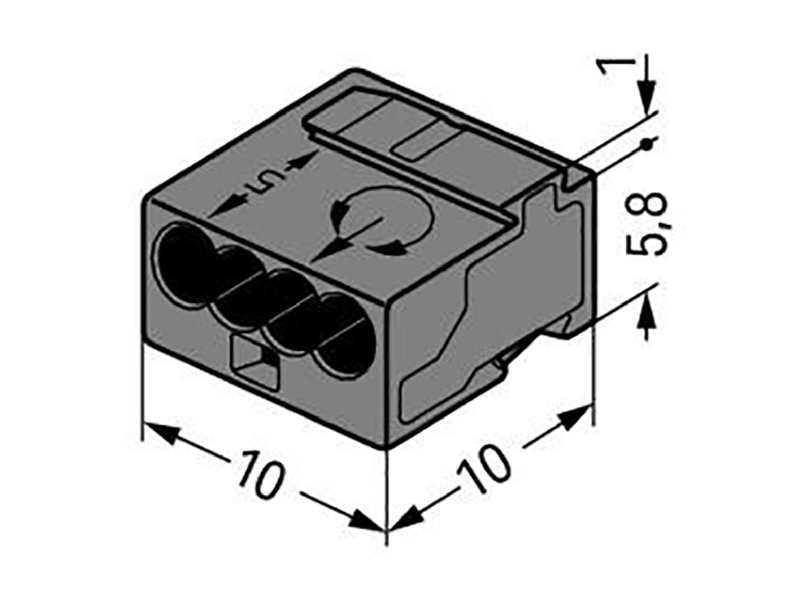 • WAGO Art.-Nr. 243-204 • Bemessungsspannung: 100C • Bemessungsstrom: 6A • Anzahl klemmstellen: 4 • Verdrahtungsrichtung: seitlich • Maße: 10x6,8x10mm
