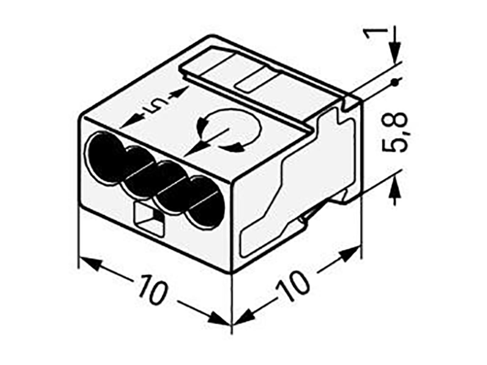 • WAGO Art.-Nr. 243-144 • Bemessungsspannung: 100V • Bemessungsstrom: 6A • Anzahl klemmstellen: 4 • Verdrahtungsrichtung: seitlich • Maße: 10x6,8x10mm • Farbe: transparent