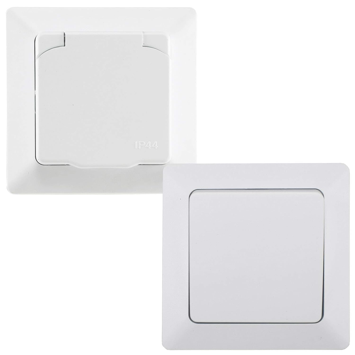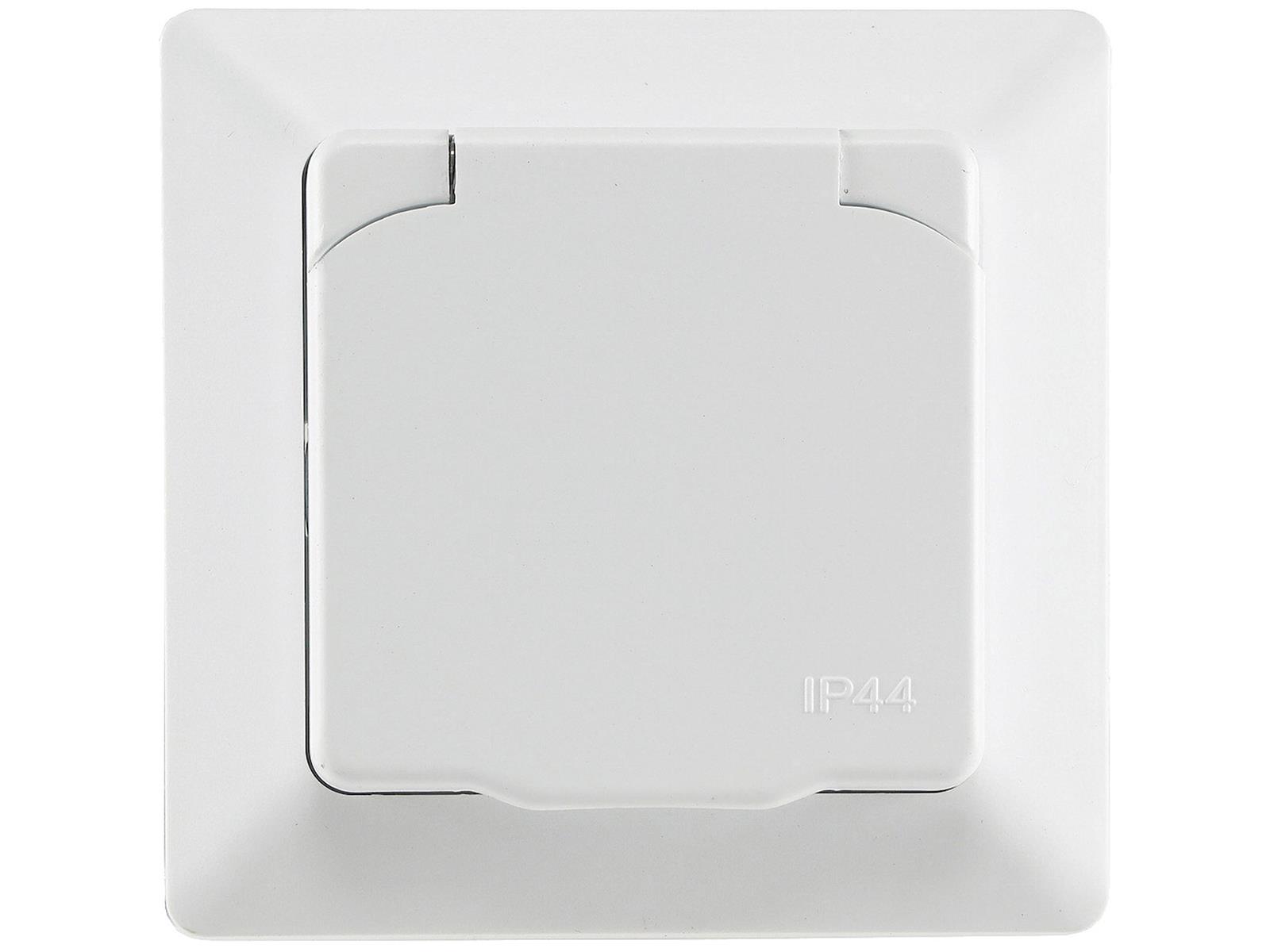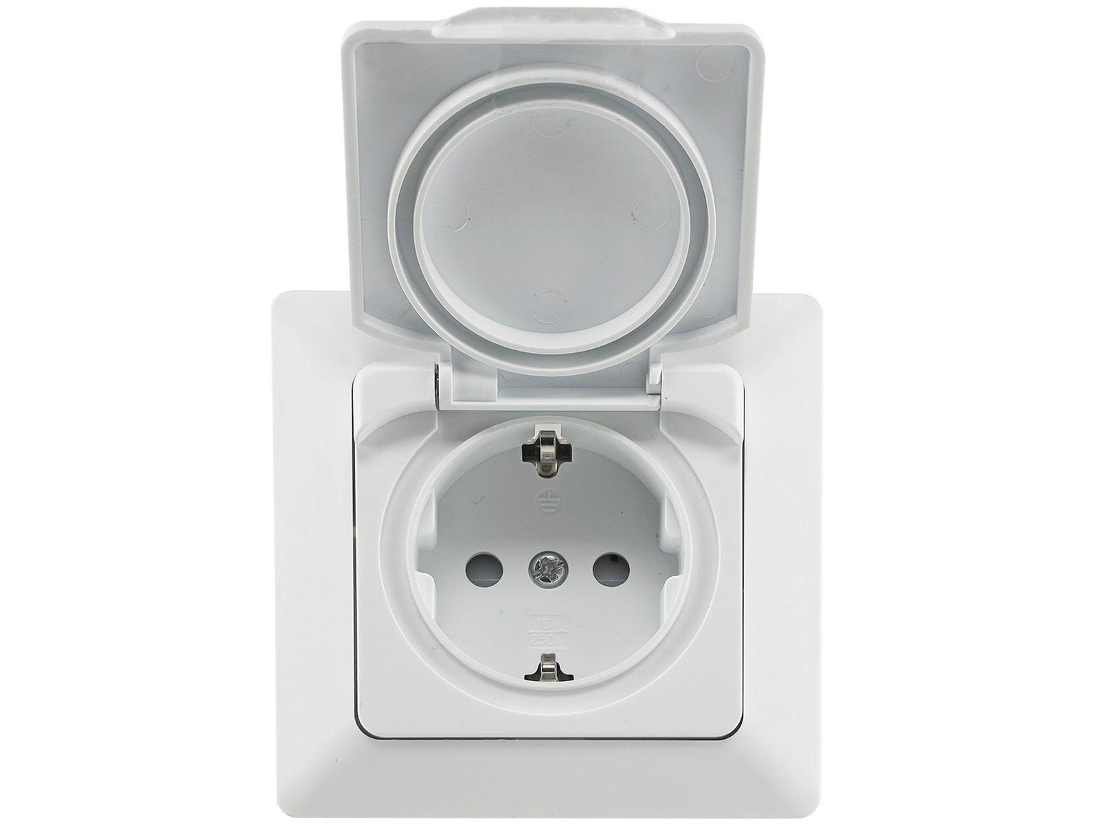 - Spritzwassergeschütze Schutzkontaktsteckdose mit Wechselschalter Schutzart IP44 für Badezimmer, Keller, Küche, Feuchtraum oder auf Terrasse, Balkon im Außenbereich. Schutz gegen Fremdkörper in der Werkstatt.