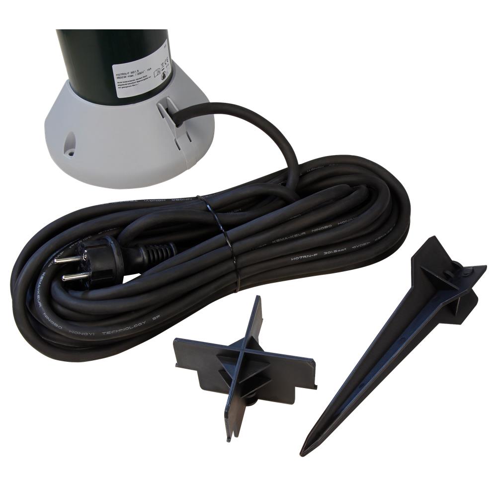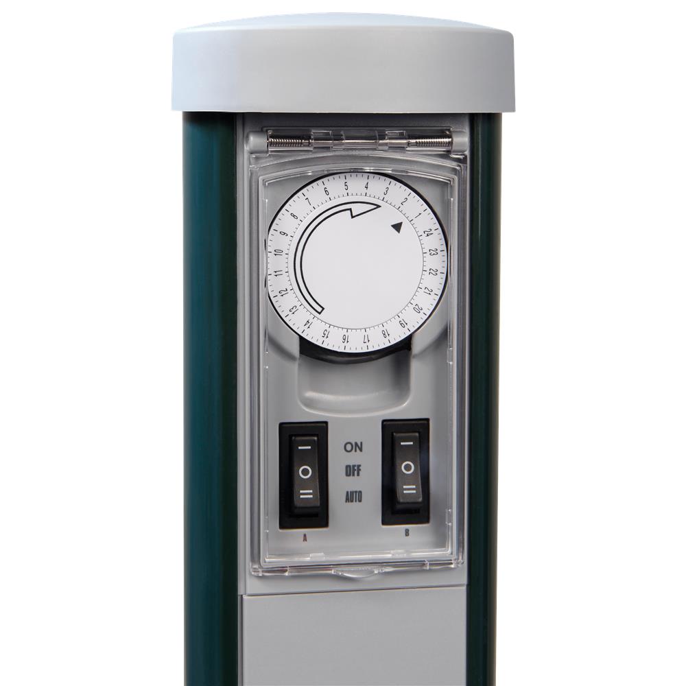 • Automatisch schalten per Zeitschaltuhr • Einstellung je Steckdose: EIN / AUS / UHR (24 h), kleinster Abstand: 15 min • 2 spritzwassergeschützte Schutzkontaktsteckdosen, IP 44 • Extra großer Anschlussraum • 3 Befestigungsarten: Anschrauben am Sockel B, mit Erdspieß (enthalten) und mit Einschlaghülse (Adapter enthalten) • 230 V~, 16 A, 3500 W • Höhe: ca. 500 mm • Austauschbare Gummi-Zuleitung mit Gummi-Stecker • 3 Schaltfunktionen je Steckdose: Manuell EIN, Manuell AUS und AUTOMATISCH per Zeitschaltuhr • Tagesprogramm (24h) • kleinster Schaltabstand 15 Min • Für die Festinstallation bestens geeignet • Leitungseinführungen f. bis zu 2,5 mm² Erdleitung