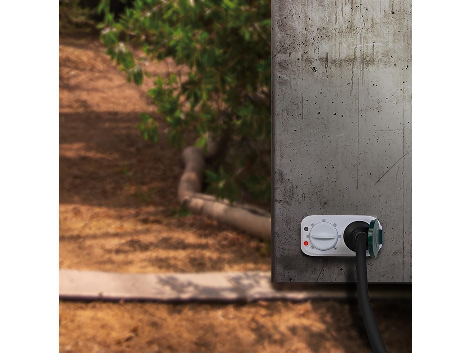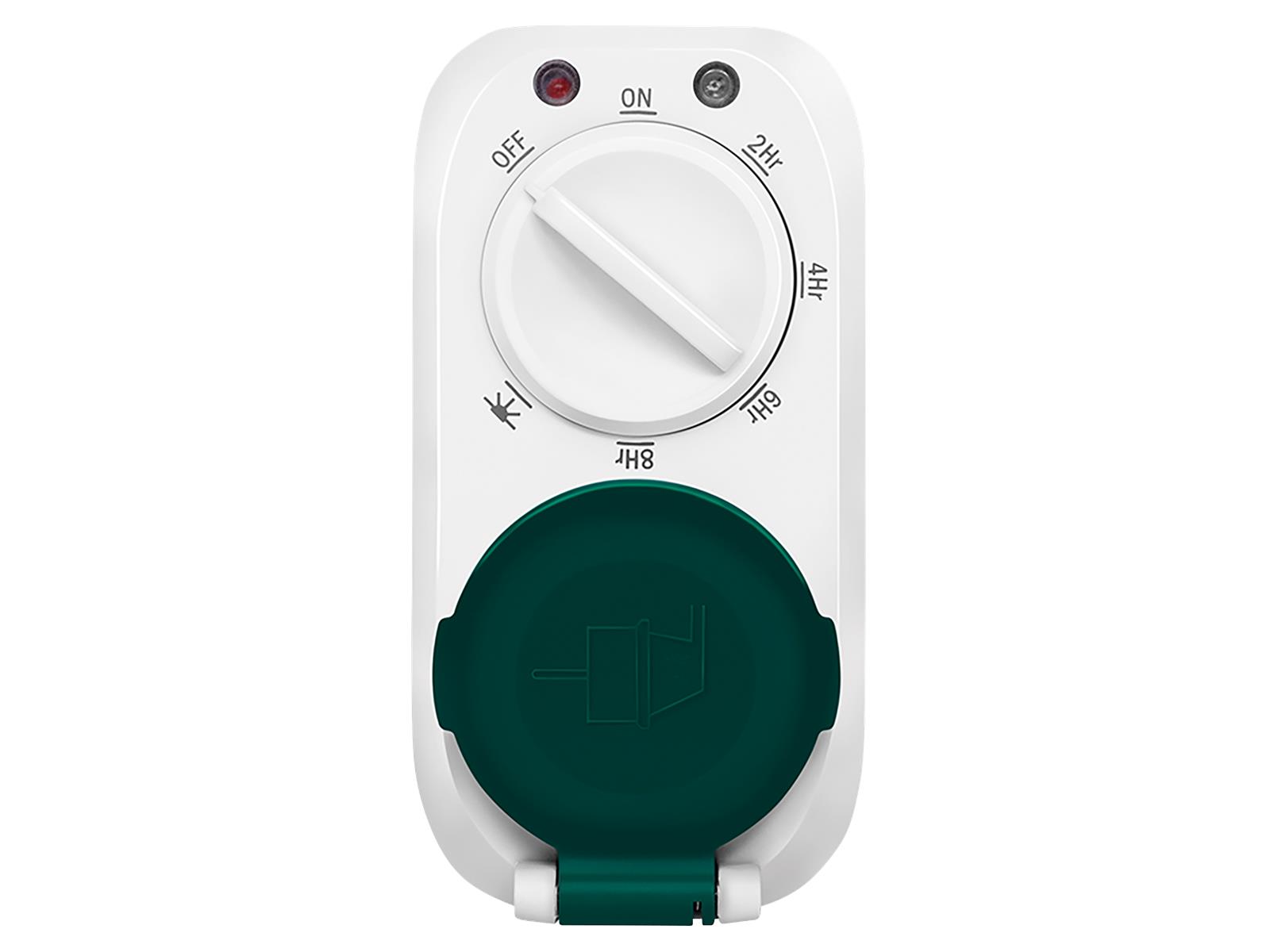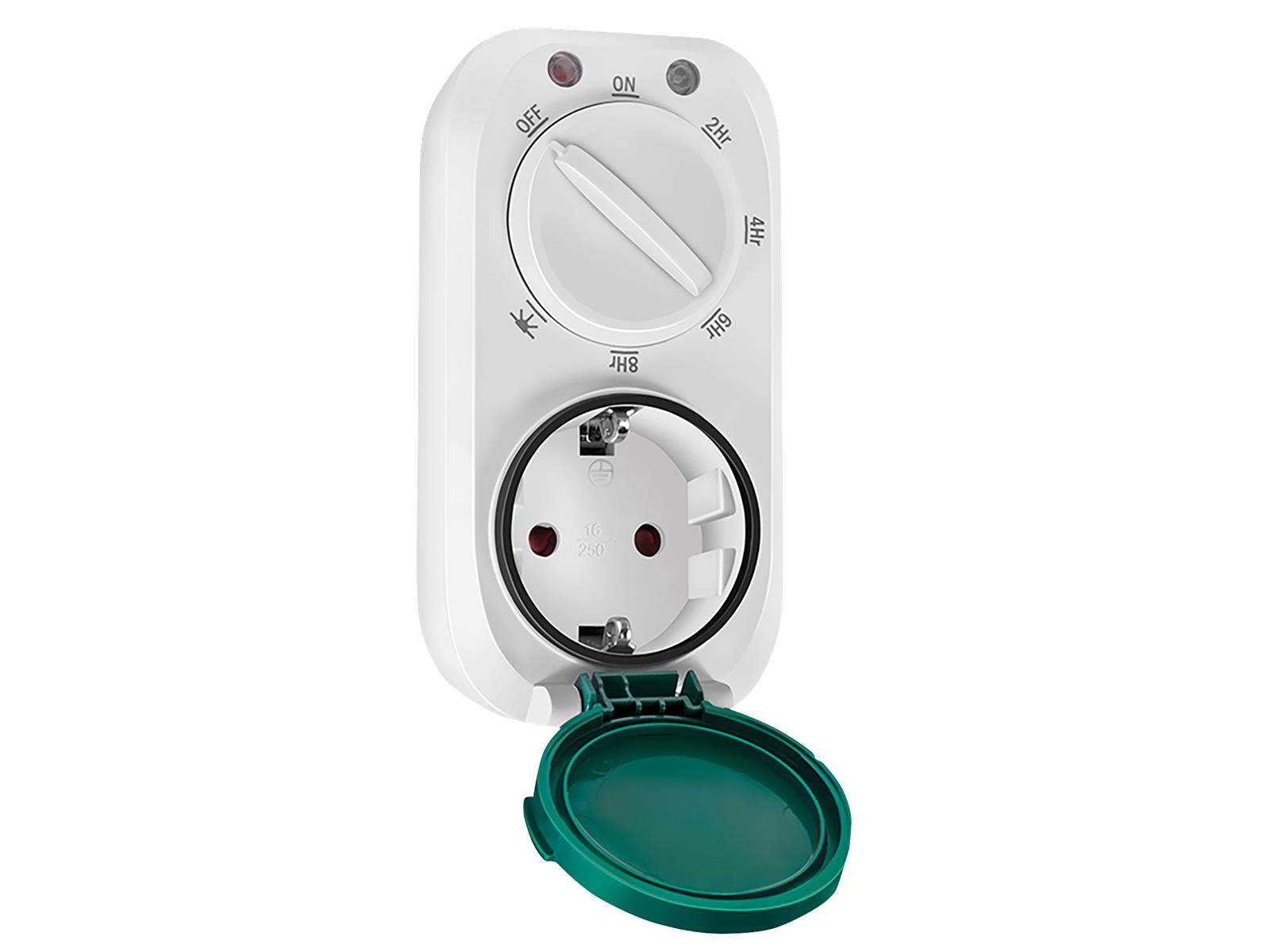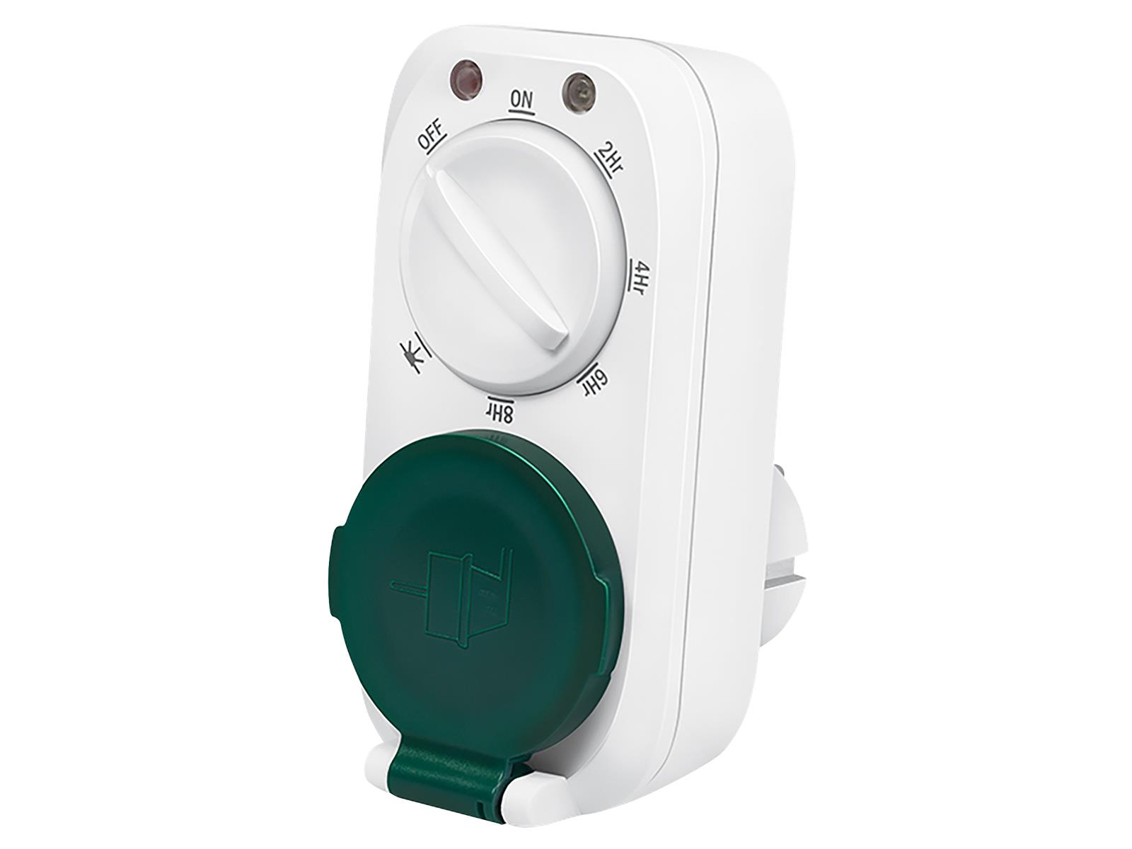 • 1x Schutzkontaktbuchse • Buchse mit erhöhtem Berührungsschutz • IP44 zum Schutz gegen Spritzwasser und das Eindringen von Fremdkörpern >1 mm • Mechanische Zeitschaltung durch Drehschalter • 7 Voreinstellungen wählbar • Modi: Ein, Aus, Dämmerung, bei Dämmerung ein und dann nach 2/4/6/8 Stunden aus • Schutzkontaktstecker • Leistung: 230V AC, 50 Hz, 16A, 3680W • Farbe: Weiß