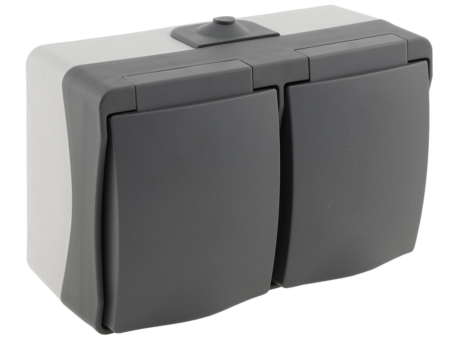 Spritzwassergeschützte Doppel-Steckdose in elegantem Design und wertigem Finish. Zweifarbiger Aufputz-Rahmen mit dunkelgrauem Deckel mit Federschließung.