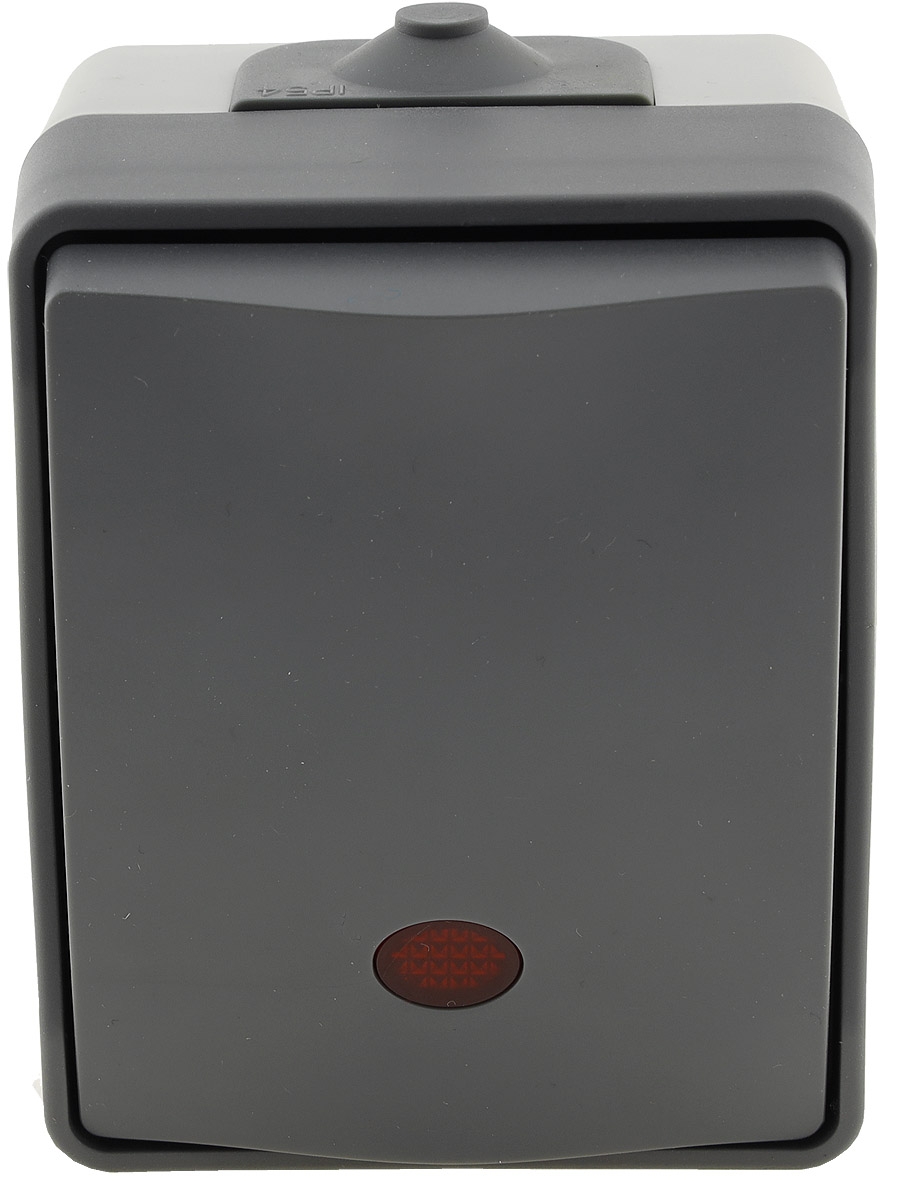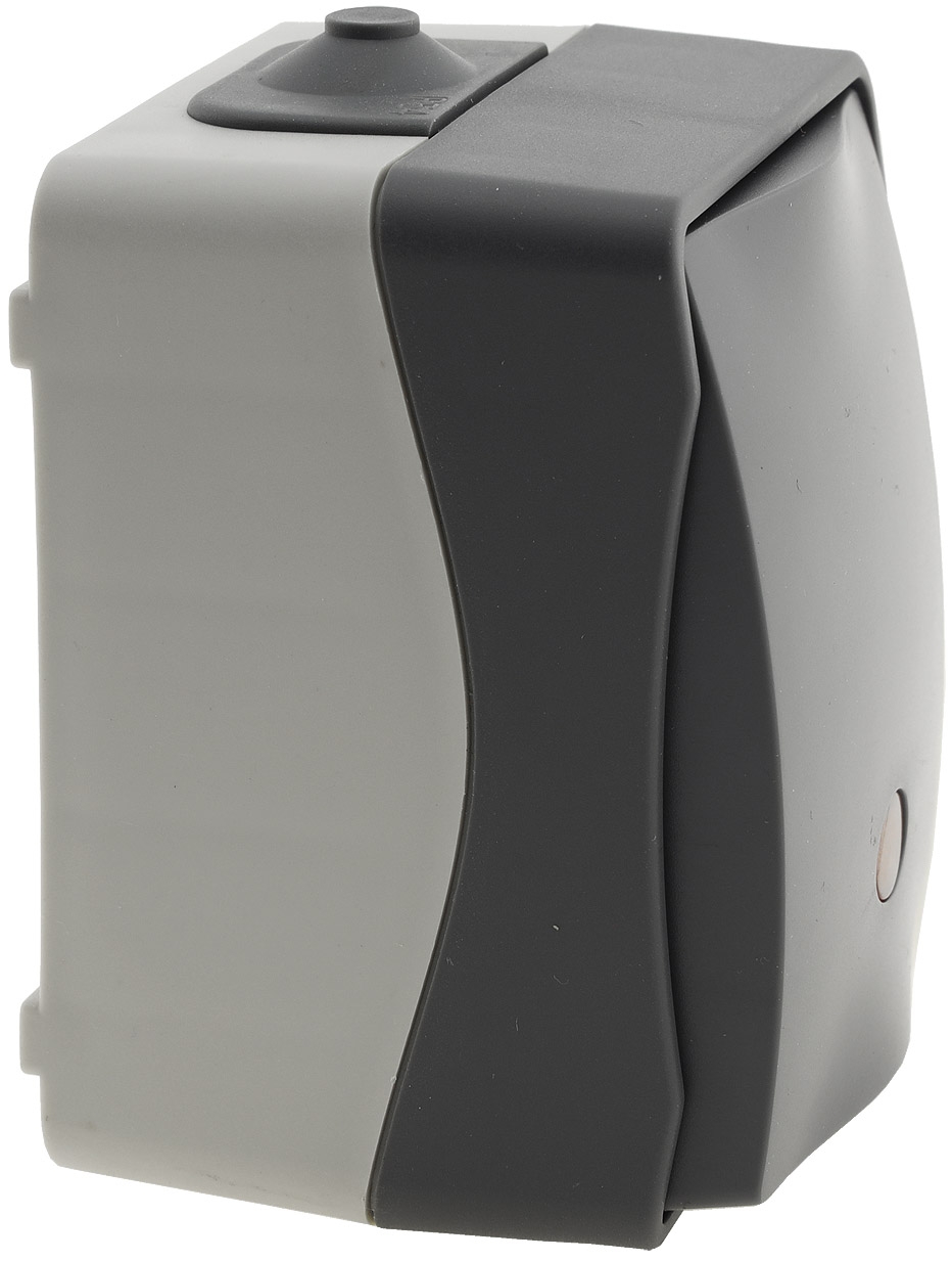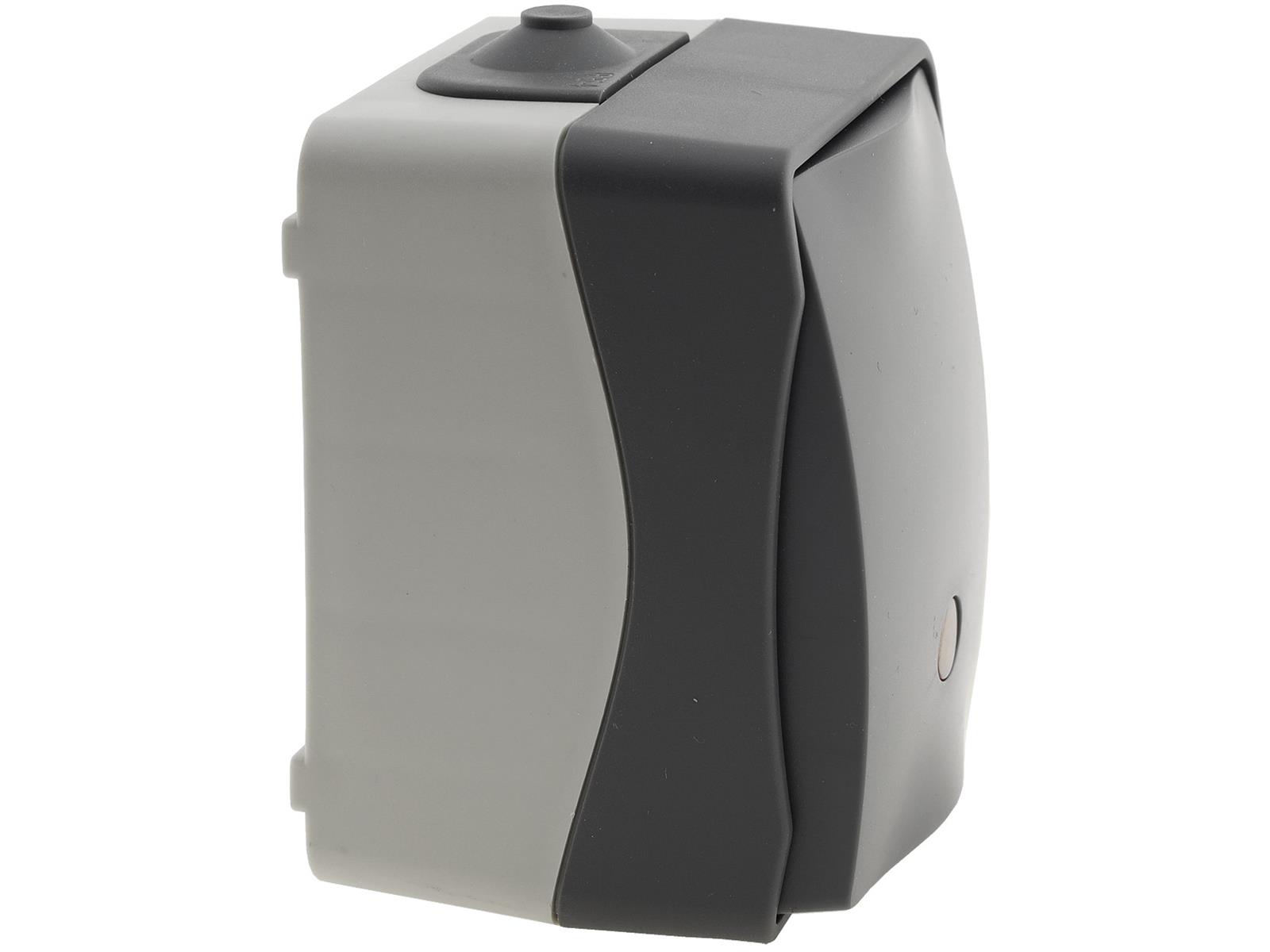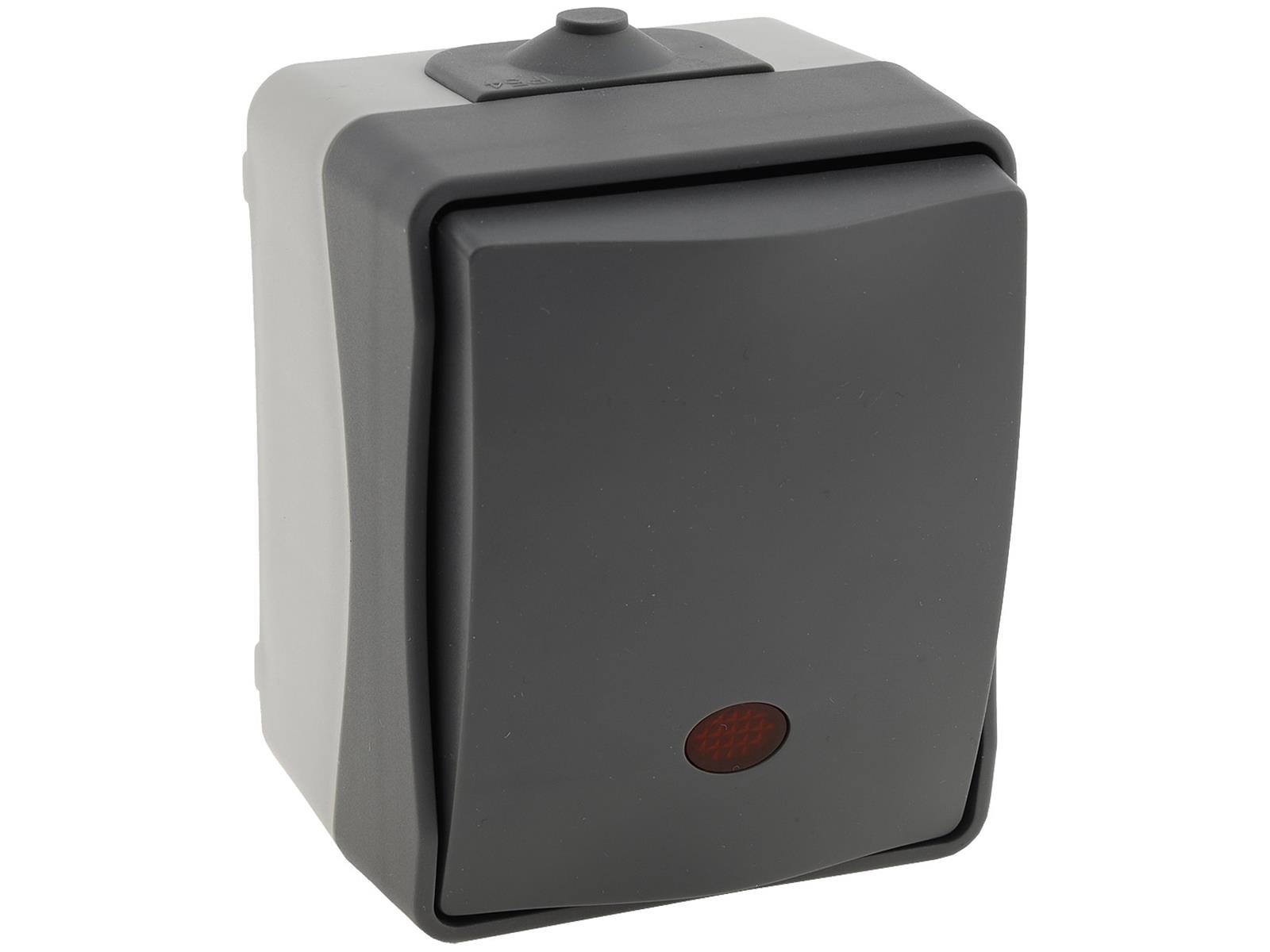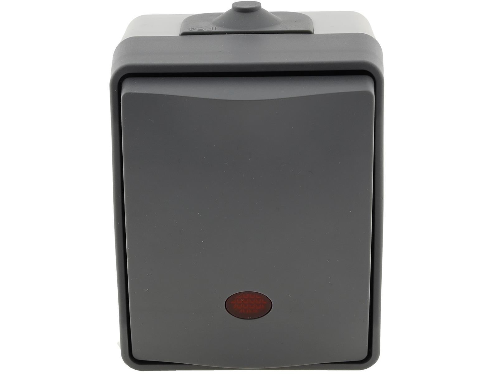 Spritzwassergeschützter Kontrollschalter mit Lämpchen in elegantem Design und wertigem Finish. Zweifarbiger Aufputz-Rahmen mit dunkelgrauem Deckel.