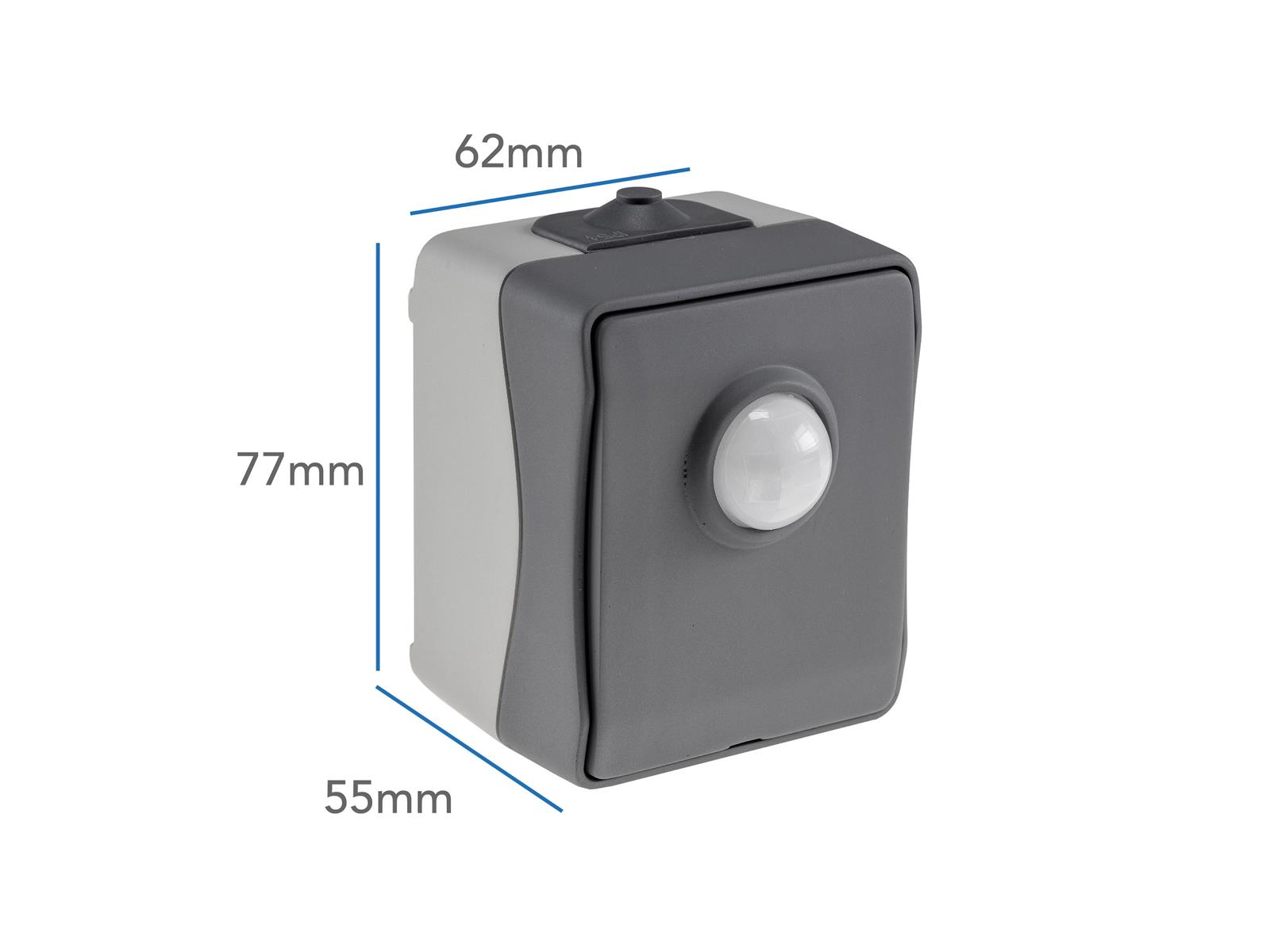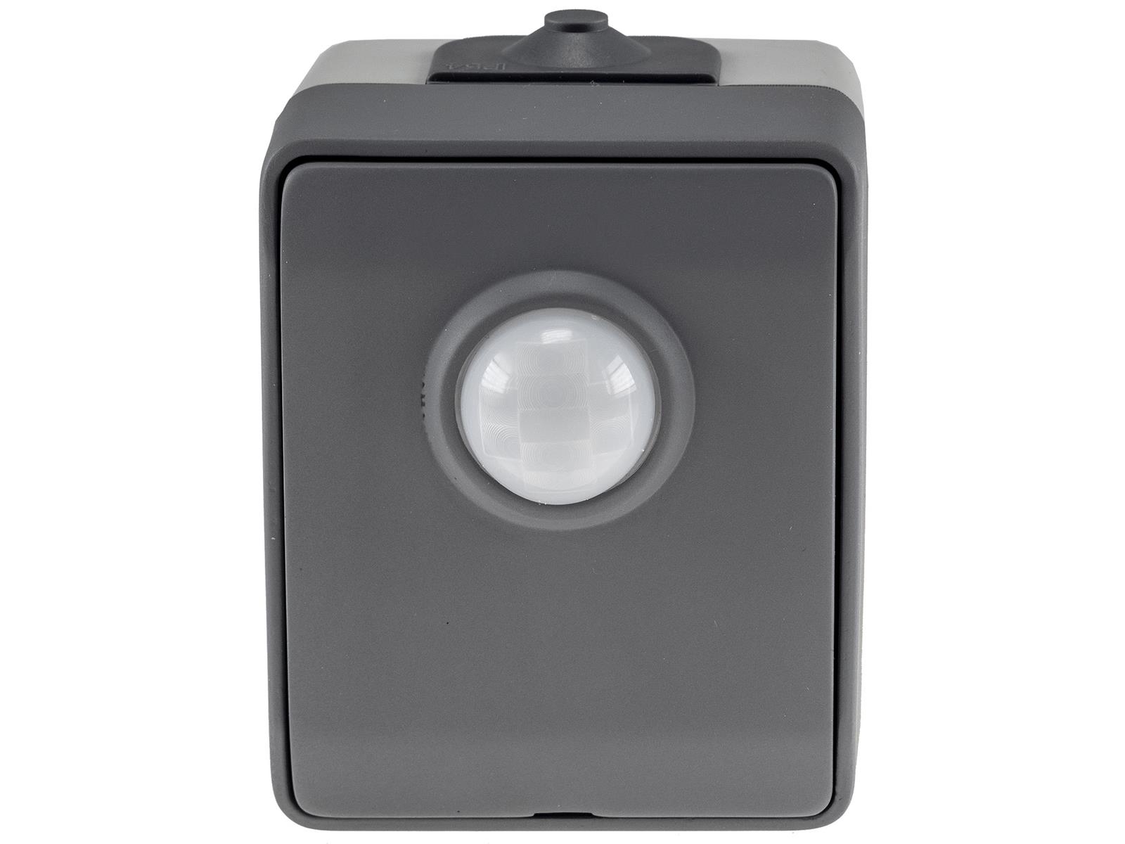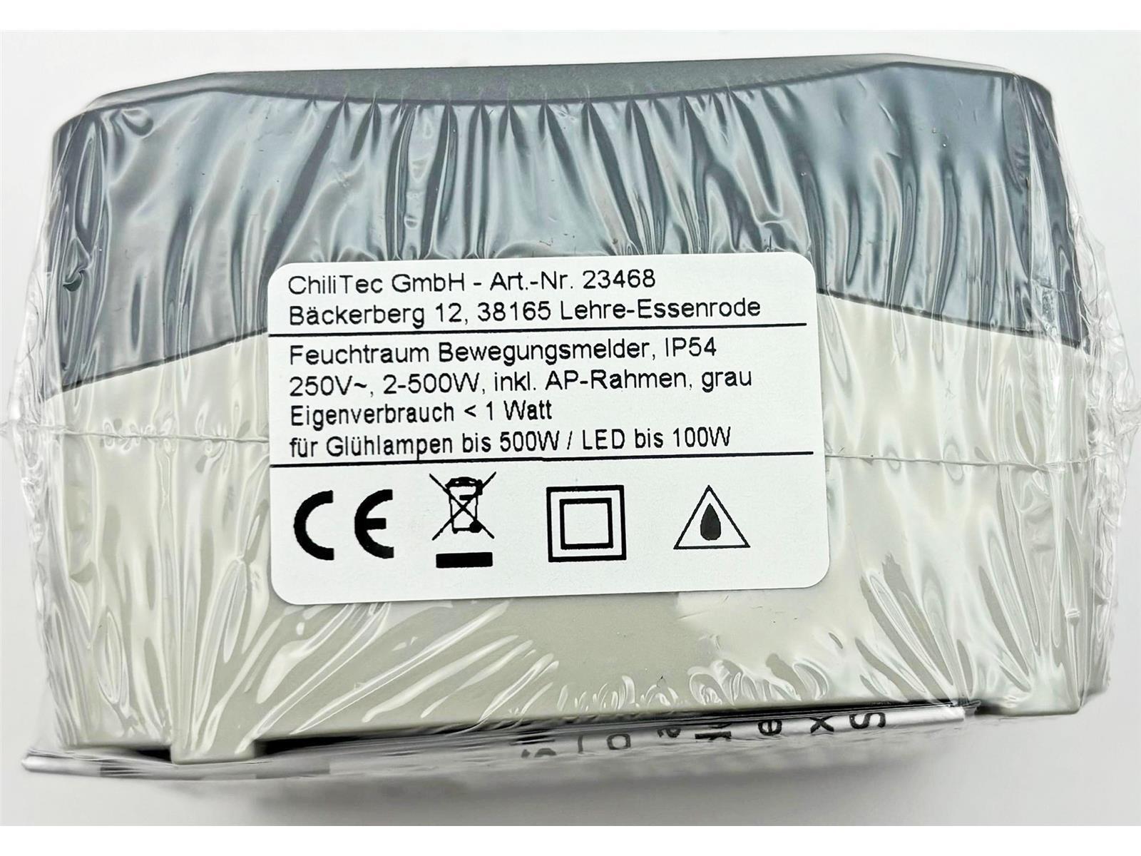 Spritzwassergeschützter Bewegungsmelder in Aufputz-Ausführung für 250V/50Hz, 2-500W. Passend für ChiliTec Feuchtraum Serie.