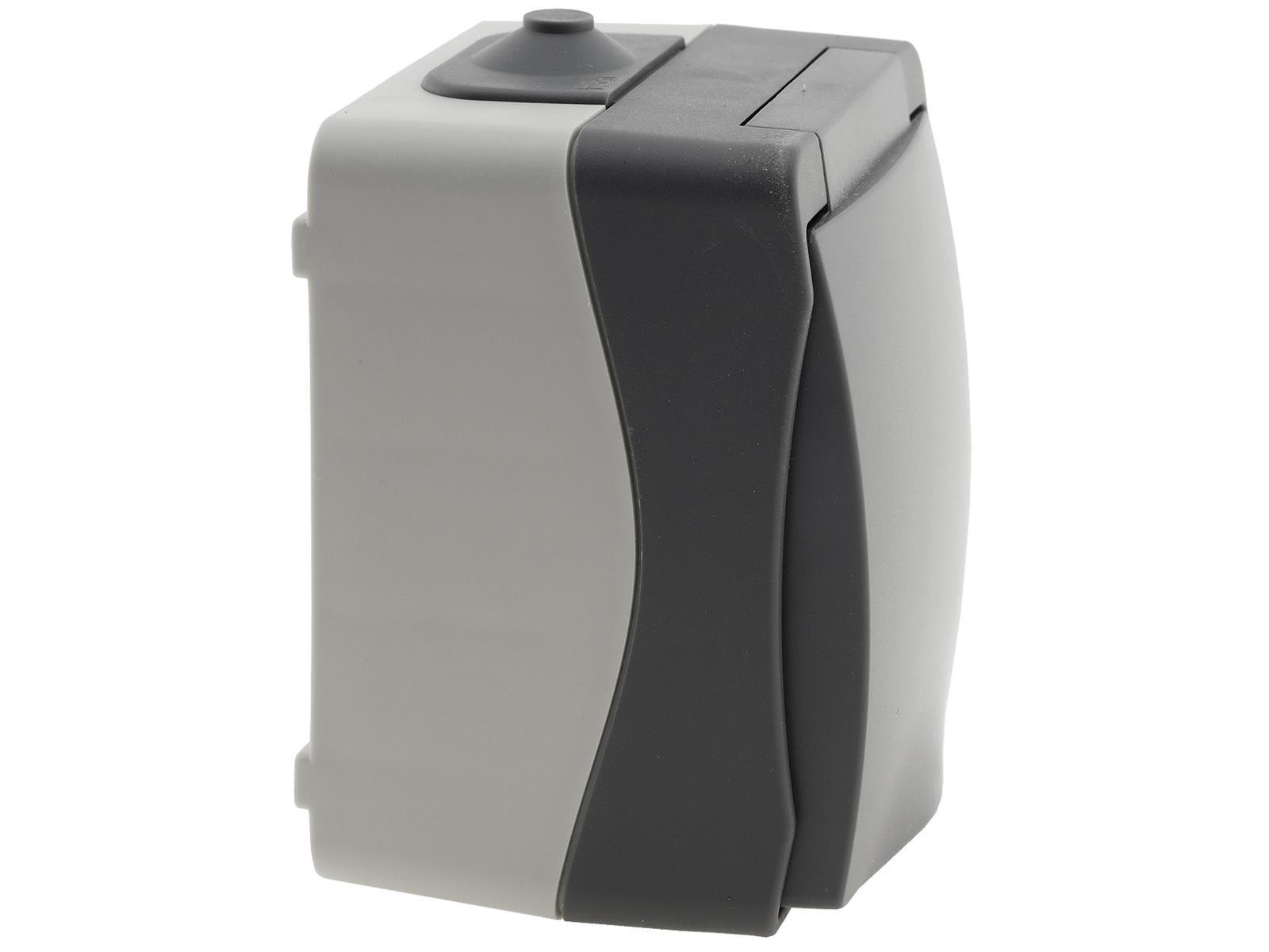 Spritzwassergeschützte Schutzkontakt-Steckdose in elegantem Design und wertigem Finish. Zweifarbiger Aufputz-Rahmen mit dunkelgrauem Deckel mit Federschließung.