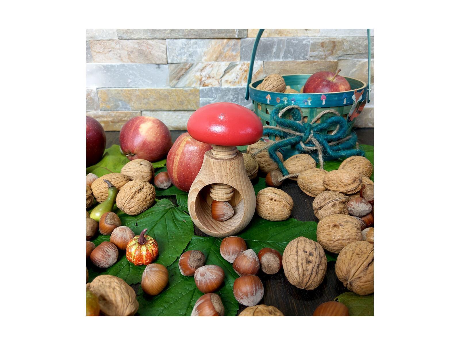 Mit wenig Kraftaufwand Nüsse knacken: Durch größeren Kopfdurchmesser sehr gut für Kinder und Senioren geeignet Für alle Arten von Nüssen geeignet Handgefertigt Dekorativ und nützlich Aus massivem, heimischem Buchenholz Leichtgängig durch geöltes SchraubgewindeHerbst- und Winterzeit ist Nusszeit, Ob zum Kochen, Kuchen backen oder als Snack für zwischendurch: Nüsse sind echtes Superfood und liefern uns gesunde Fette und Proteine die unser Körper gerade in der grauen Jahreszeit dringend brauch, Mit unserem handlichen Nussknacker in Pilzform können alle Nüsse geknackt werden Egal ob Sie lieber Walnüsse, Haselnüsse, Mandeln oder Macadamia Nüsse essen - Dieser Pilz knackt auch Nüsse mit harter Schale, Einfach die gewünschte Nuss in den Pilz aus Holz legen, die Handfläche vor die öffnung legen und den Pilzkopf drehen, Durch die Abdeckung der öffnunfliegen die Schalen nicht wild in der Wohnung umher, Auch für Kinder und Senioren geeignet: Durch die Krafteinwirkung der Holzschraube gelingt es ohne große Kraft Nüsse zu knackenEin weiterer großer Vorteil unseres Nussknackers ist es, dass auch bei Unachtsamkeit keine Finger oder Haut eingeklemmt werden, Die Nussknacker werden aus einheimischem Buchenholz hergestellt und anschließend geölt, Durch die hochwertige ölung kann dieser Nussknacker auch als Dekoration eingesetzt werdenBuche ist als Hartholz besonders langlebig und gut für Küchen- und Haushaltsartikel geeignetSollte das Gewinde sich schwerer drehen lassen oder quietschen, kann man einfach einen Tropfen Sonnenblumenöl darauf geben, Selbst die Kleinsten unter uns können, durch den größeren Kopf und die ergonomische Form, spielend leicht Nüsse knacken oder den Nussknacker zum Basteln von Tieren aus Kastanien verwenden, Durch die fordere ca, 4 cm große öffnung kann man die Kastanien einspannen, um ein Loch hineinzubohrenUnser Tipp: Die hartnäckigsten Nüsse vor dem Knacken eine Stunde ins Gefrierfach oder über Nacht Wasser legen, Dadurcwird die Schale leichter zu knacken sein, Versprochen! Ein weiterer Vorteil: Man erhält meist ganze Hälften,