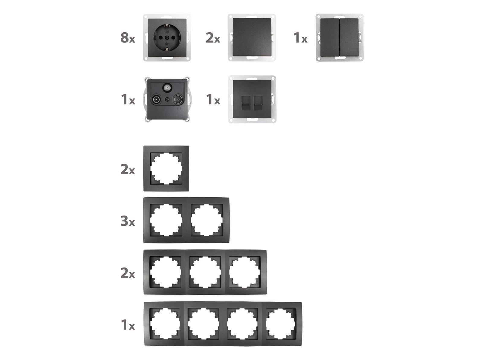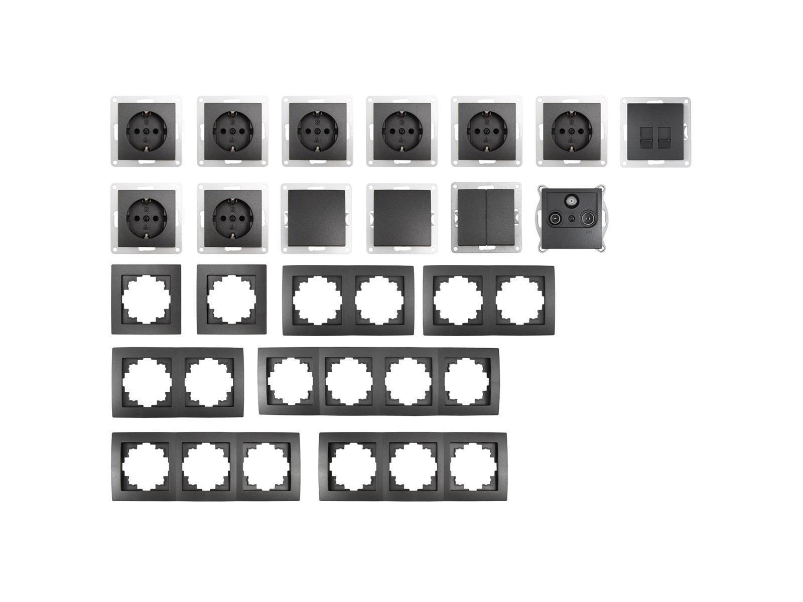 • Set aus der Flair Serie bestehend aus: • Schutzkontakt-Steckdose McPower ''Flair'', 250V~/16A, UP, 8 Stück • Wechselschalter McPower ''Flair'', 250V~/10A, UP, 2 Stück • Serien-Schalter McPower ''Flair'', 2-fach, 250V~/10A, UP, 1 Stück • Antennendose McPower ''Flair'', 250V~/16A, UP, 1 Stück • Netzwerkdose McPower ''Flair'', 250V~/ 2xRJ45, UP, 1 Stück • Rahmen McPower ''Flair'', 1-fach, 2 Stück • Rahmen McPower ''Flair'', 2-fach, 3 Stück • Rahmen McPower ''Flair'', 3-fach, 2 Stück • Rahmen McPower ''Flair'', 4-fach, 1 Stück