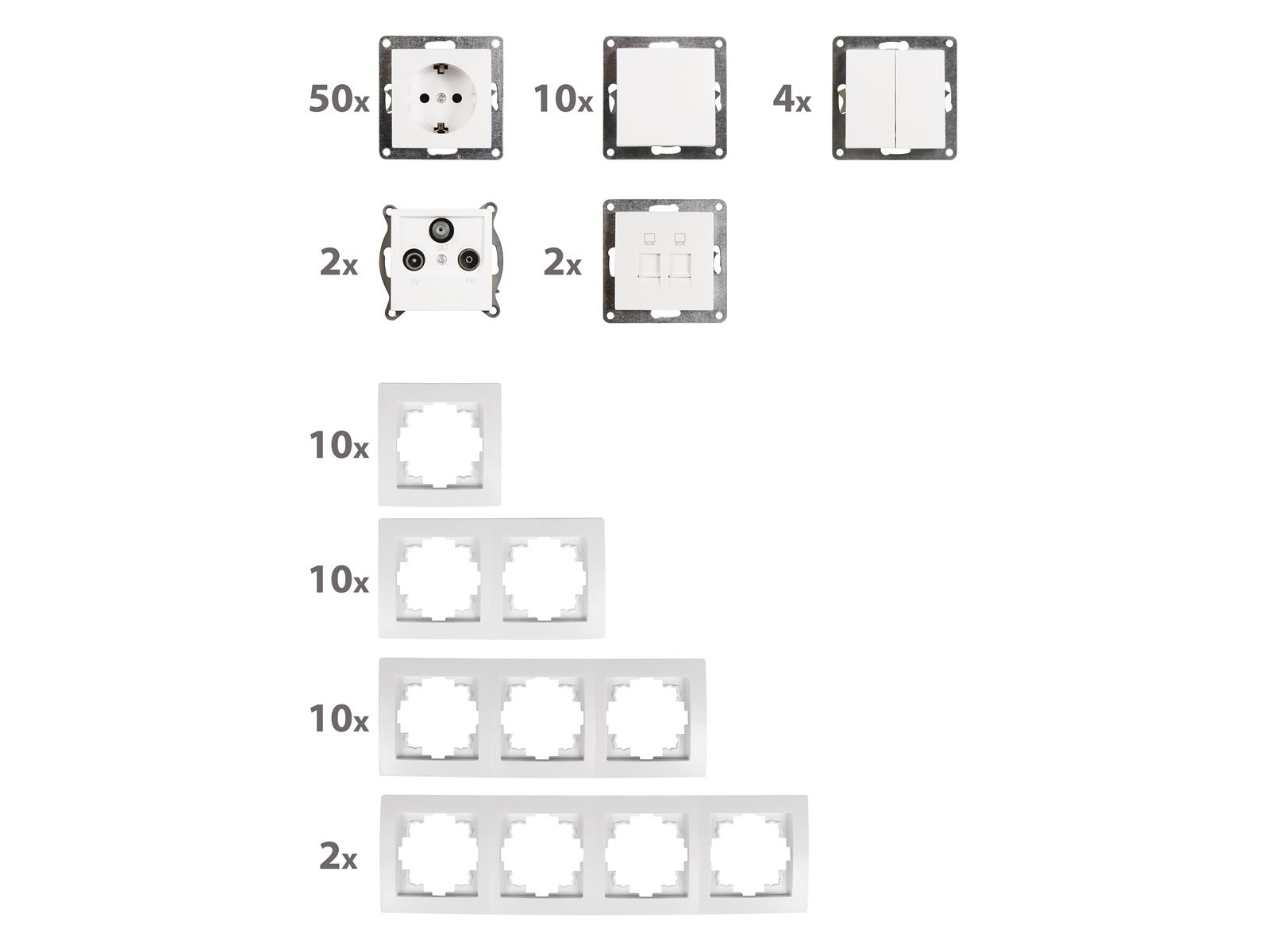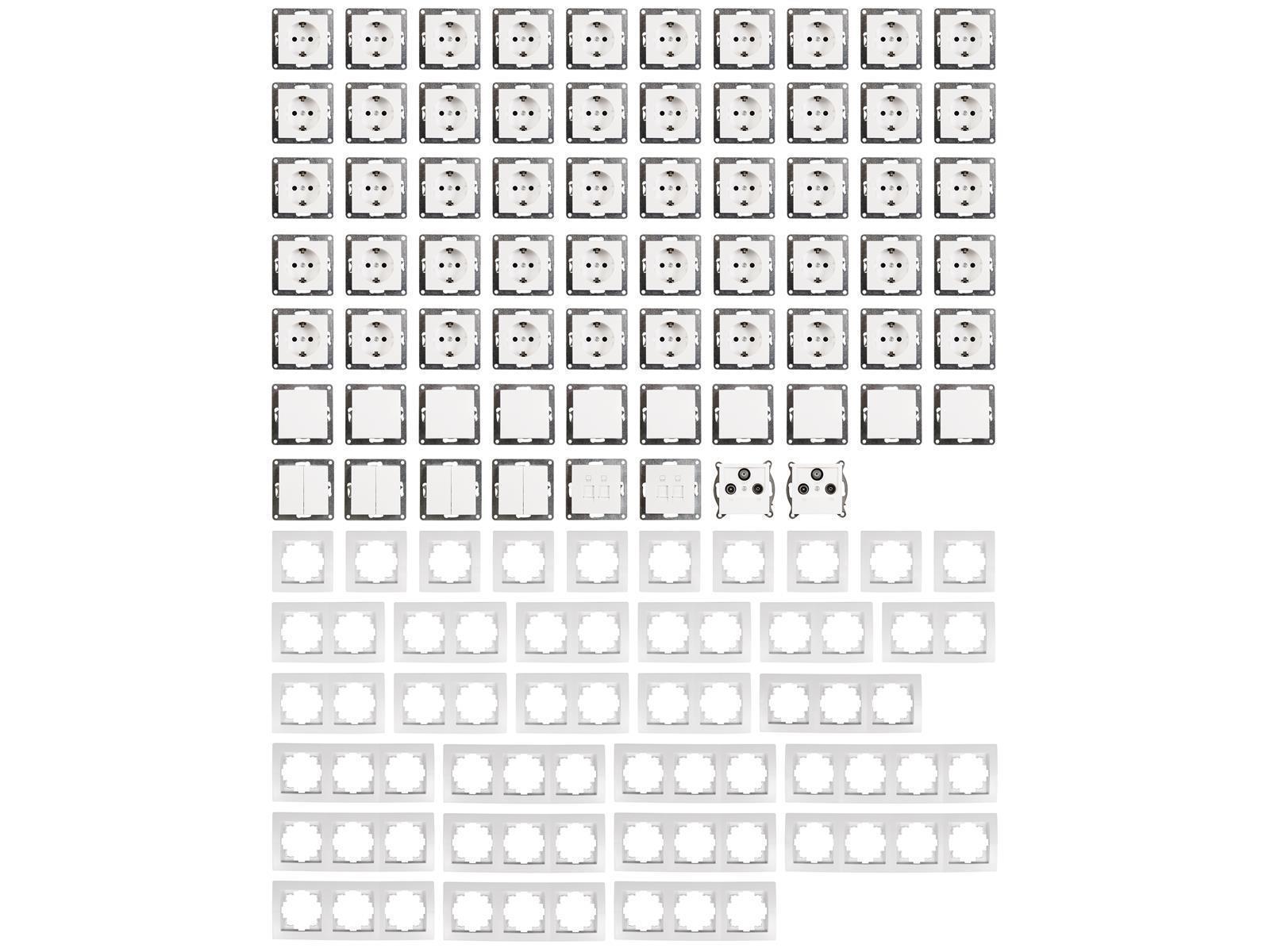 Großes 100-teiliges flexibles Schalterprogramm Set mit Steckdosen + Rahmen bestehend aus:
