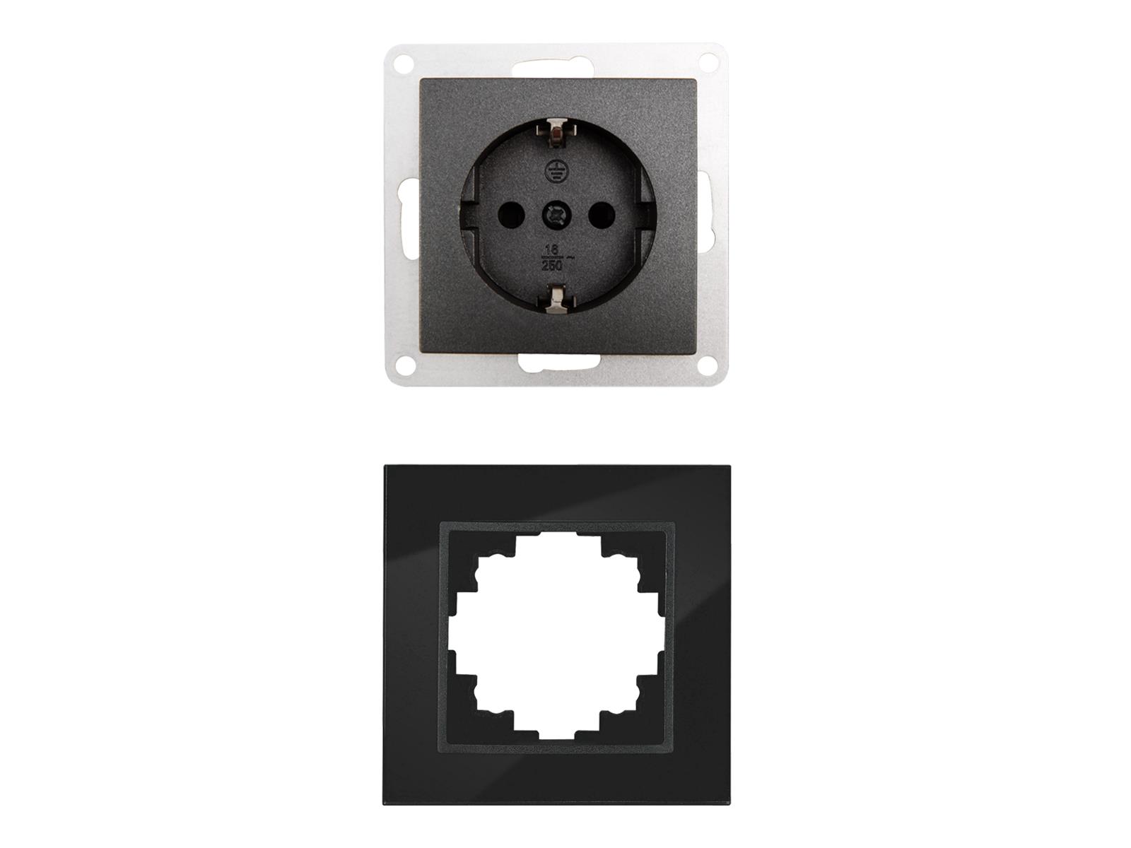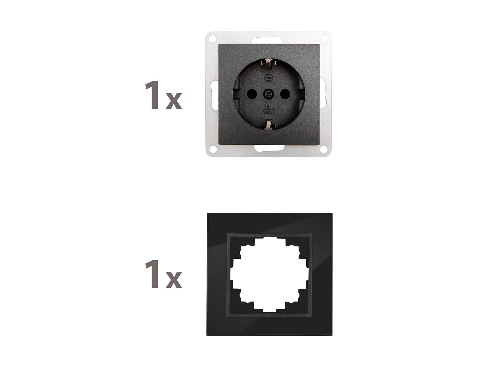 • Unterputz Schutzkontakt-Steckdose • 250V~/16A • mit Einsteckschutz / Shutter • mit Glasrahmen • BxHxT: 80x80x40mm • passend für Hohlwanddosen mit 68mm-Ø
