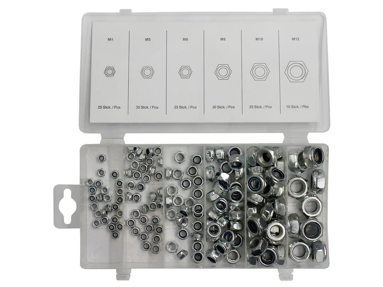 • Selbstsichernde Sechskant-Muttern • 150 tlg. • Größen: M4 - 25 Stk.: M5 - 35 Stk.: M6 - 25 Stk.: M8 - 30 Stk.: M10 - 25 Stk.: M12 - 10 Stk.