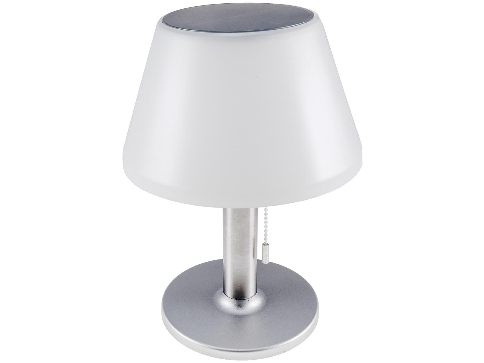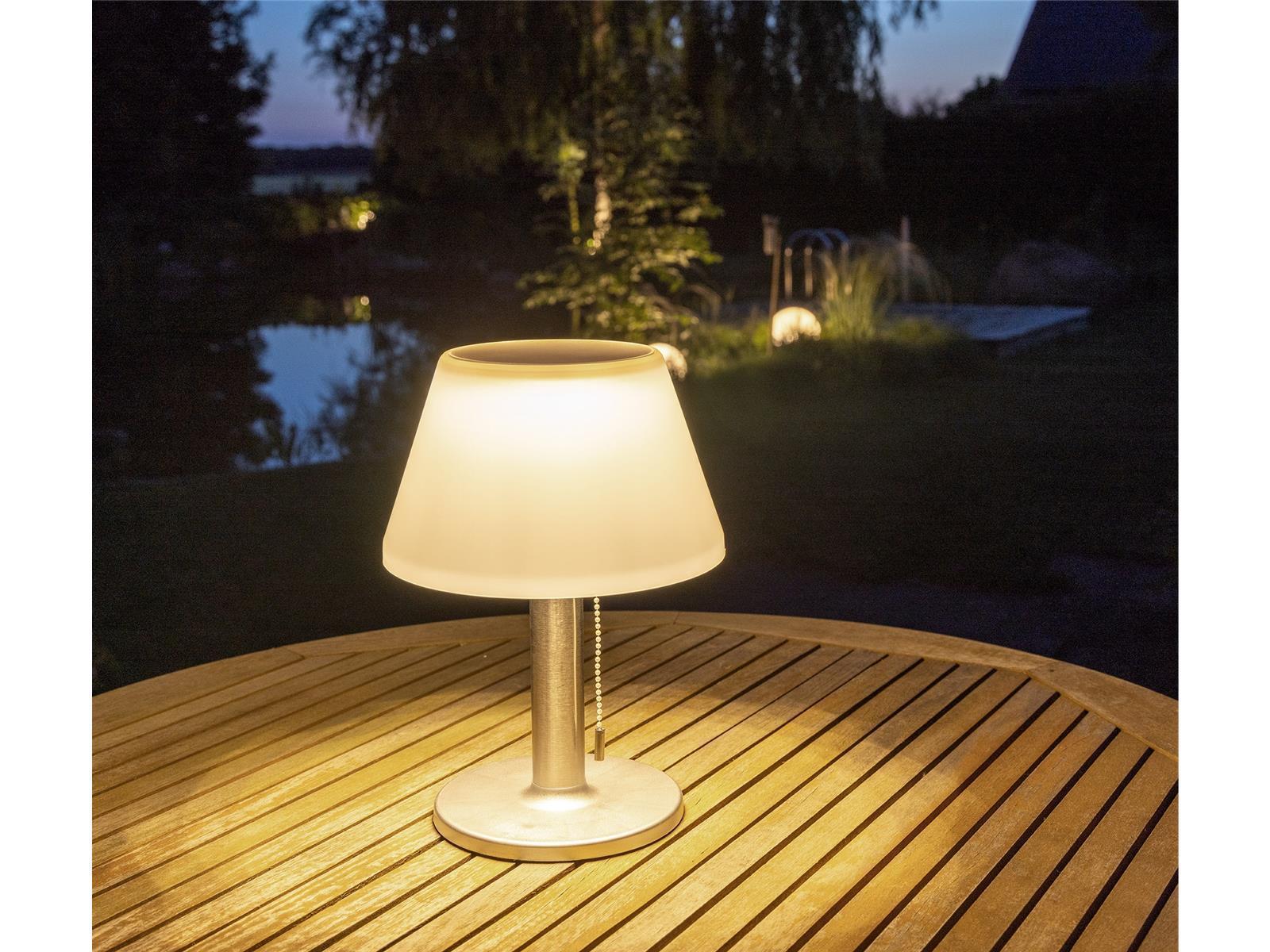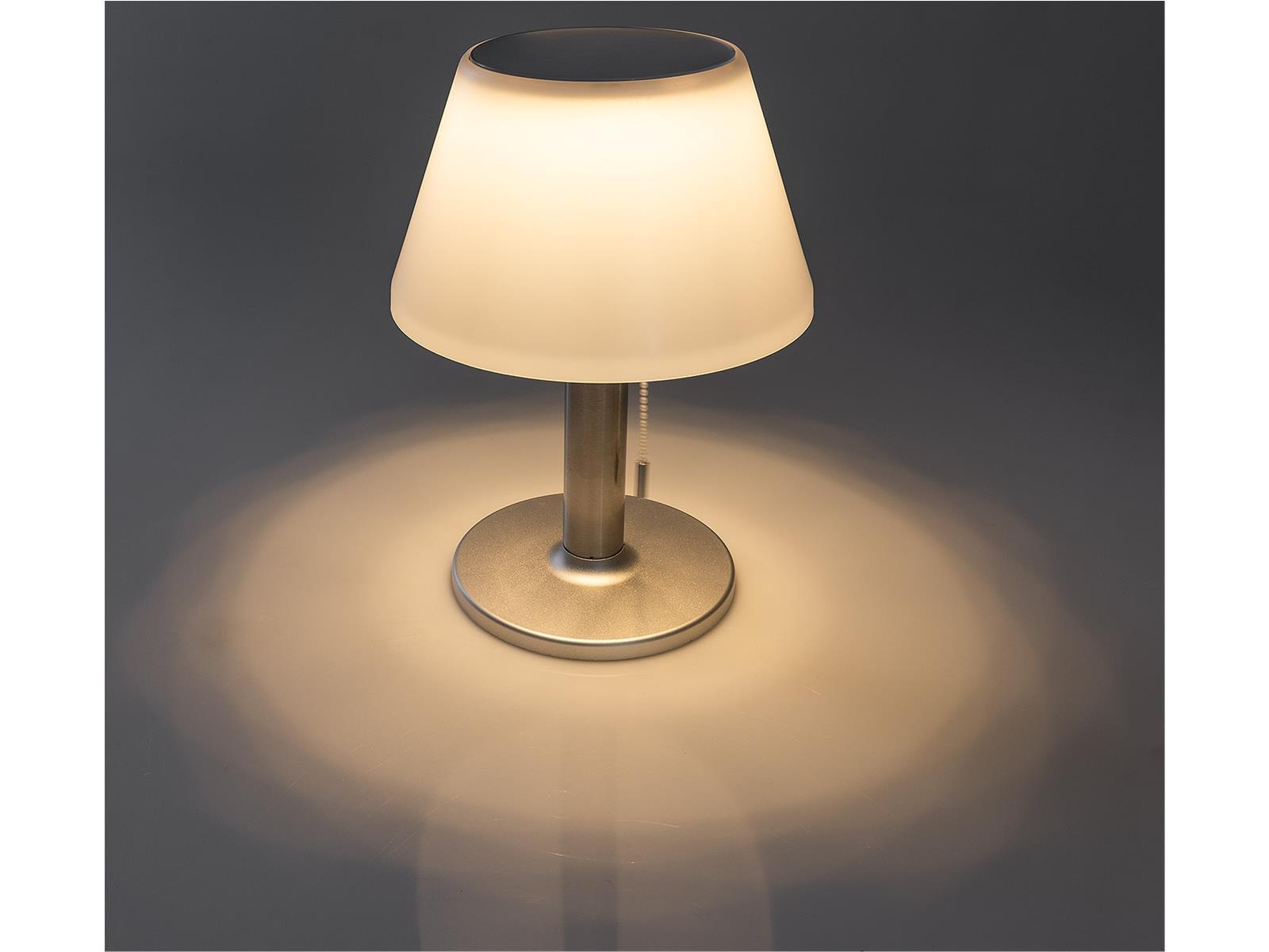 Elegante Solar-Tischleuchte mit drei Schaltstufen. Helligkeit 3fach einstellbar per Zugschalter.
