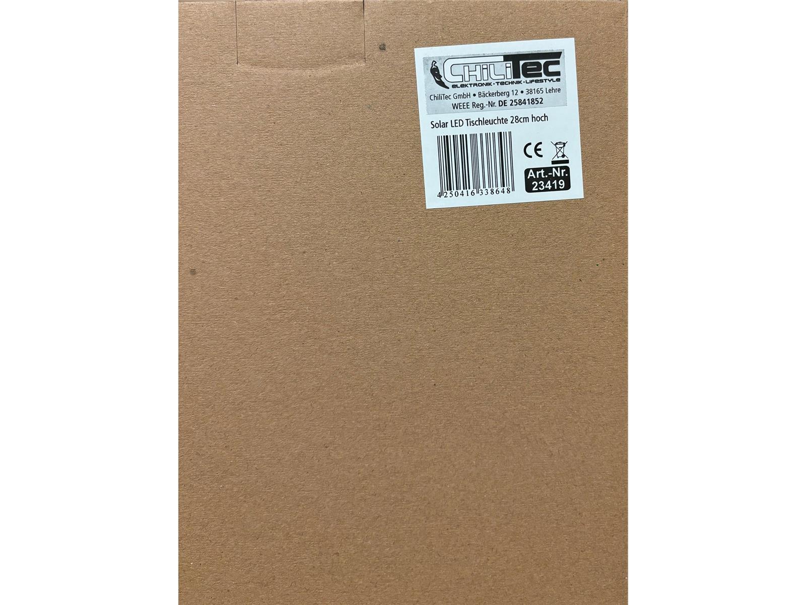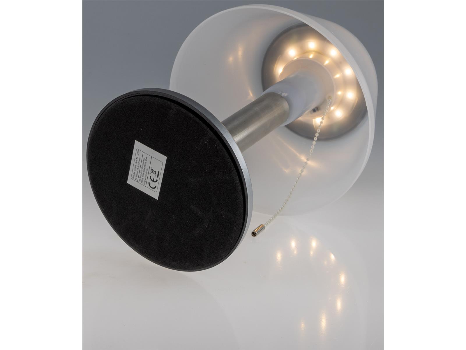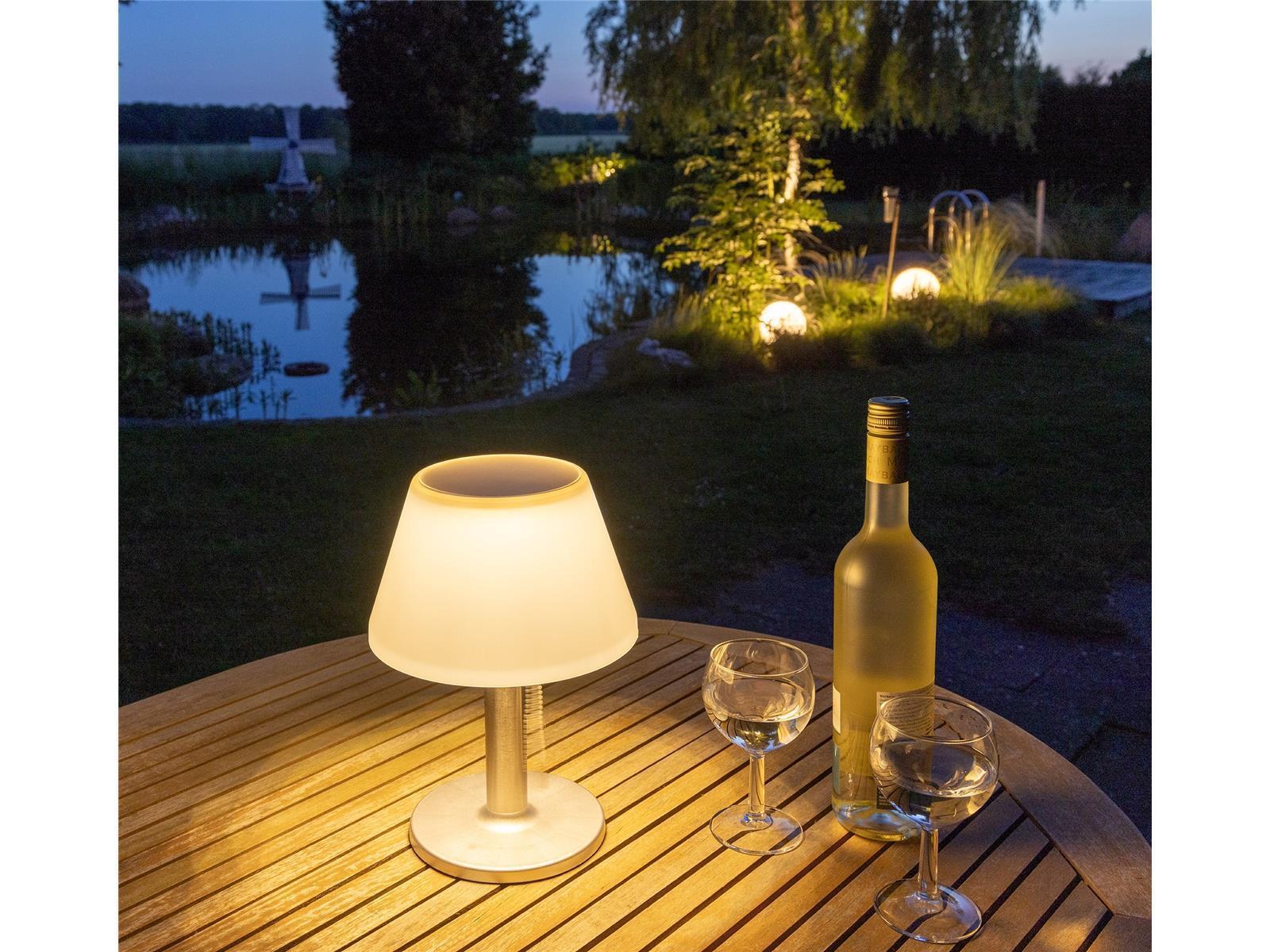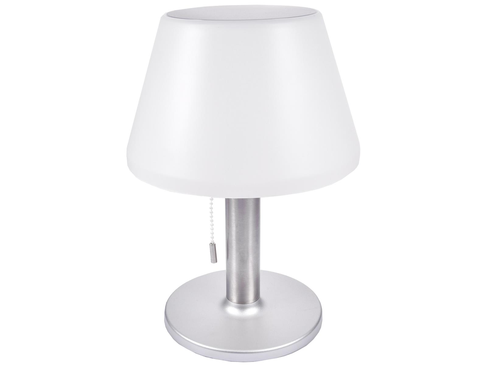 Elegante Solar-Tischleuchte mit drei Schaltstufen. Helligkeit 3fach einstellbar per Zugschalter.