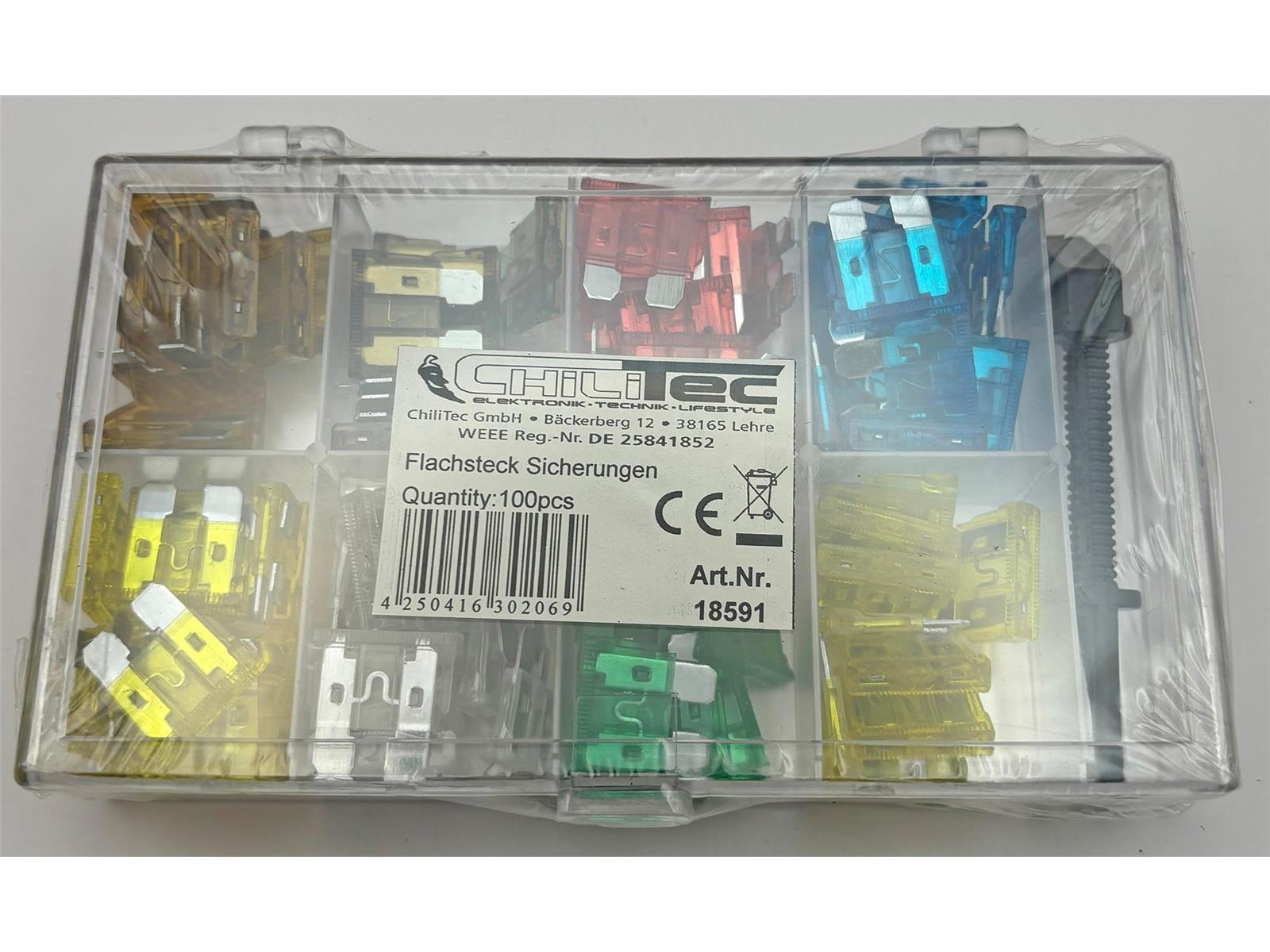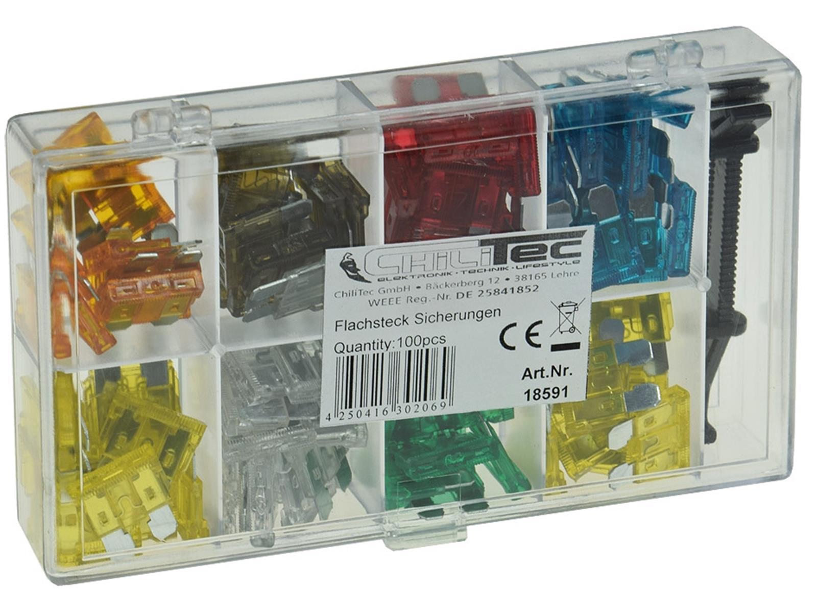 Die meist gebrauchten Flachsteck Sicherungen für Auto und Zweirad in praktischer Sortimentsbox, Inhalt: 100 Stück