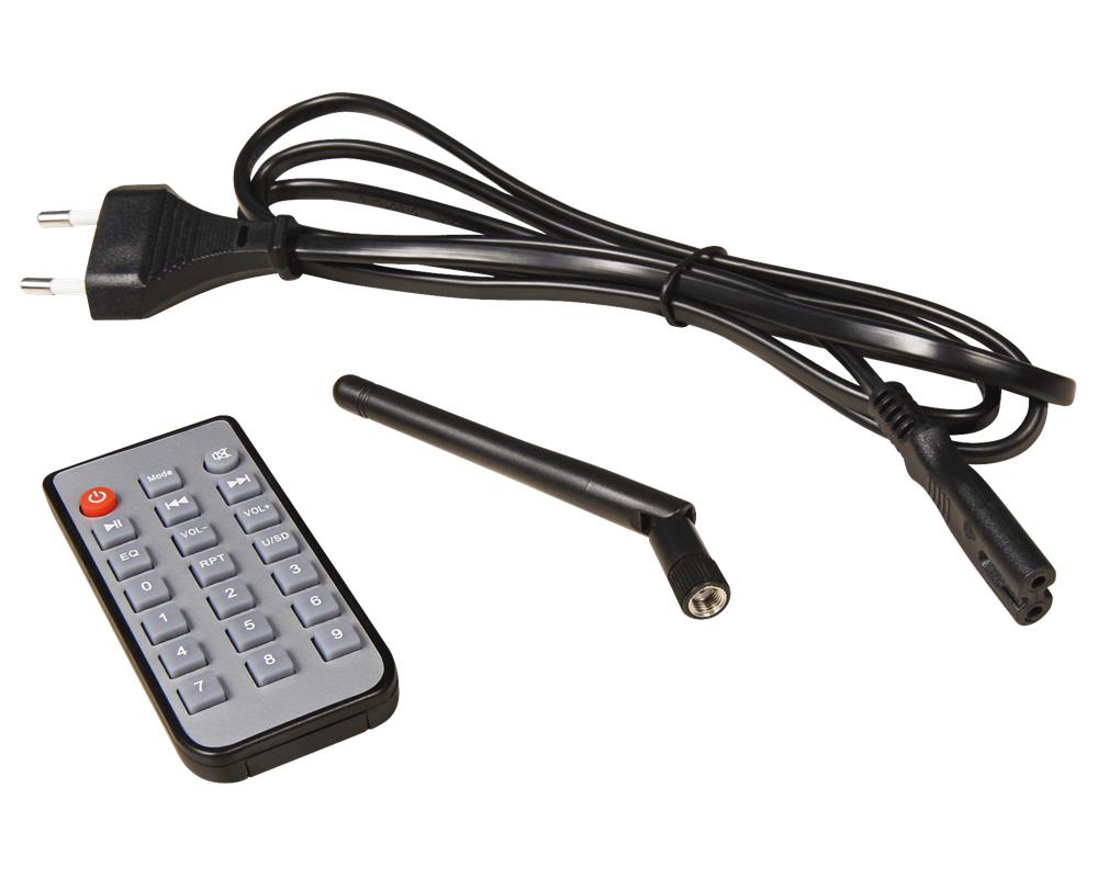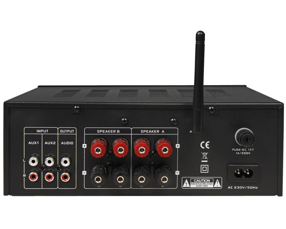 • Stereo Kompaktverstärker • Leistung 160W Musik (4 Ohm) • Frequenzbereich 20Hz bis 40 KHz (±3 dB) •Klirrfaktor <0,3% (1 Khz, 1W) • S/N Ratio 83 dB • Leistungsaufnahme 75W • Eingänge 2 x RCA (Stereo), SD, USB, und Bluethooth • Ausgänge 1 x Pre Out- Rca (Stereo), 2 x LS ((R/L), 3,5mm Kopfhörer-Klinke • incl. Fernbedienung • Klangregelung bass und Treble• Betriebsspannung 230 V AC/50Hz • Maße LxBxH: 250 x 180 x 95 mm • Gewicht 2,9kg