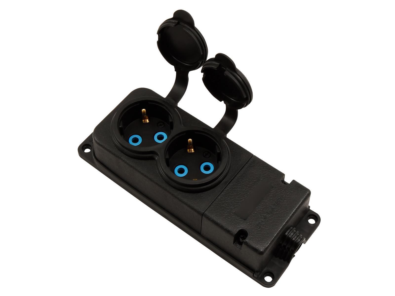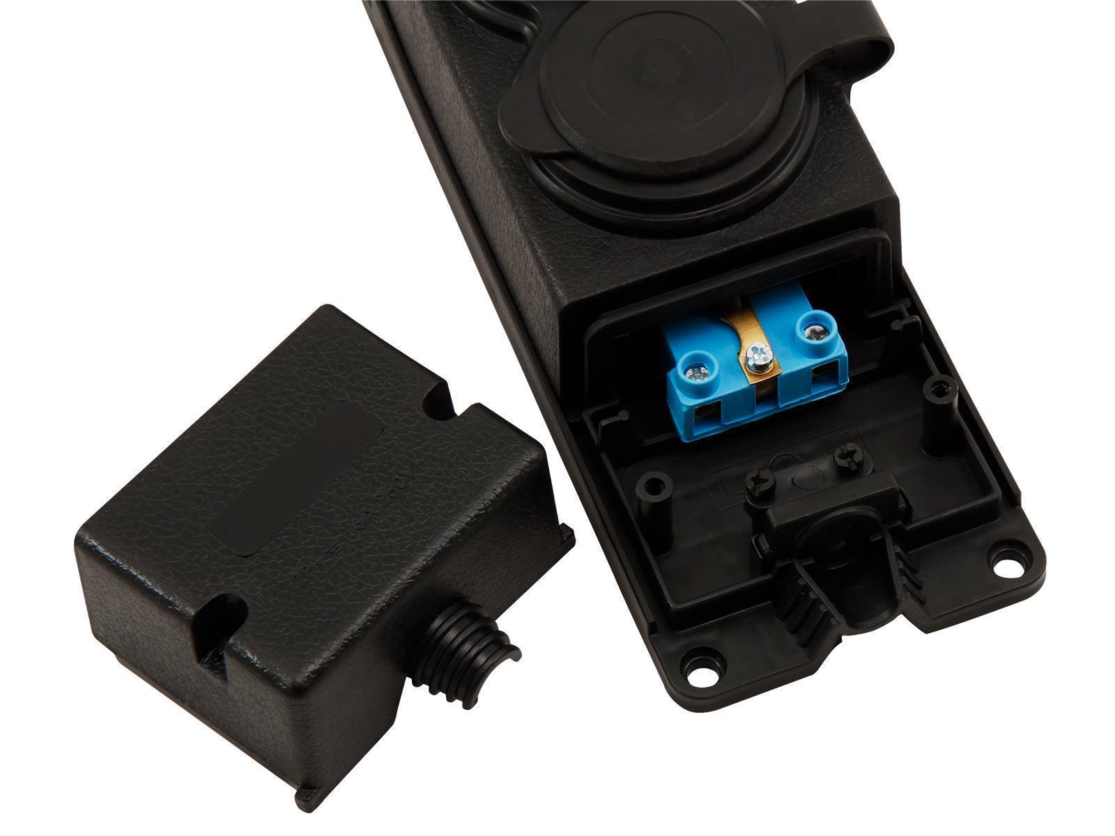 • 2fach Schutzkontakt Steckdoseleiste • 250 V~ • 16 A • für Kabel der Typen H05VV-F 3x 1,0 mm² oder 3x 1,5 mm² • IP44 • Material Kautschuk • Farbe schwarz • flammhemmendes Gehäuse