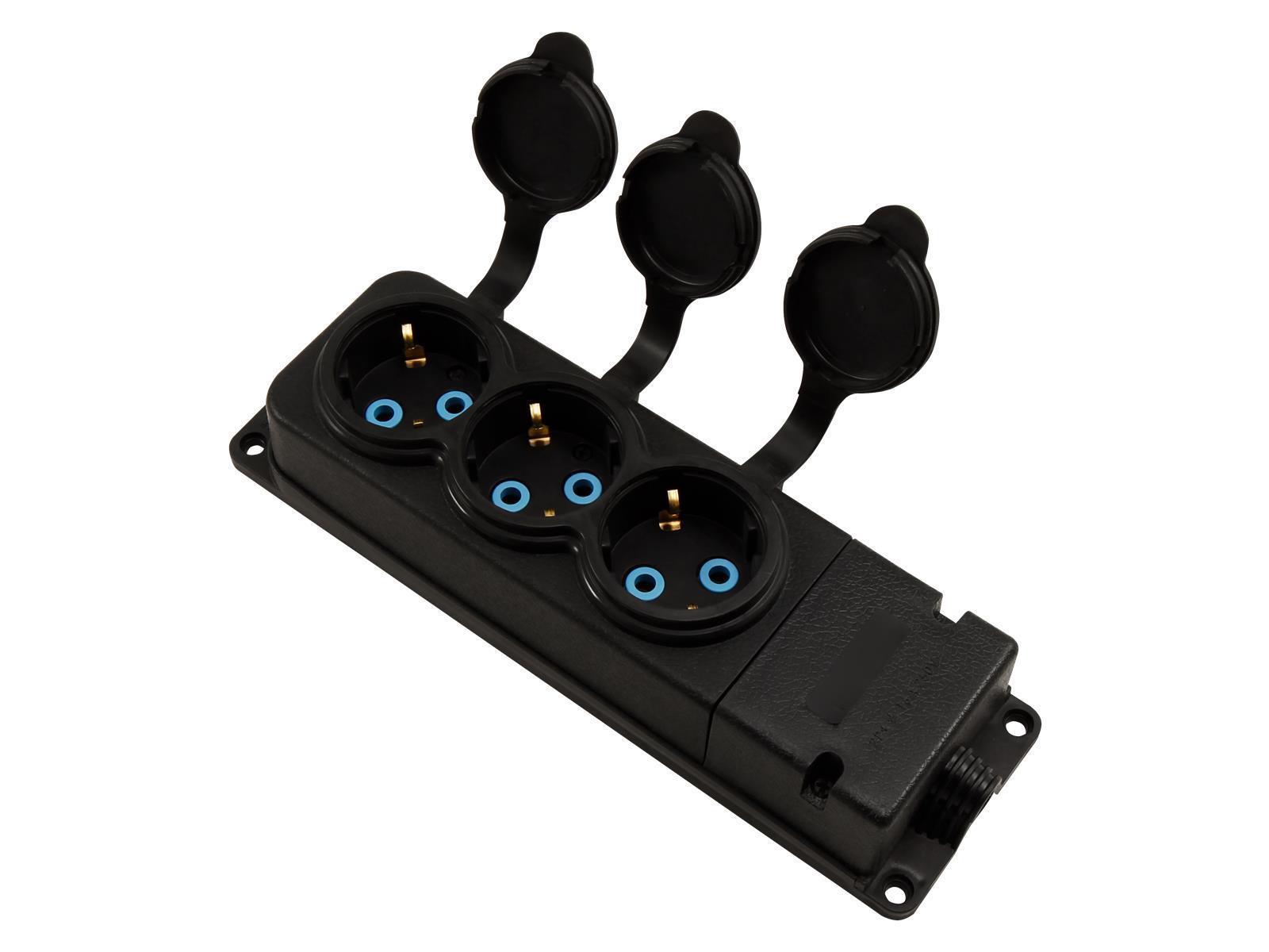 • 3fach Schutzkontakt Steckdose • 250 V~ • 16 A • für Kabel der Typen H05VV-F 3x 1,0 mm² oder 3x 1,5 mm² • IP44 • Material Kautschuk • Farbe schwarz • flammhemmendes Gehäuse