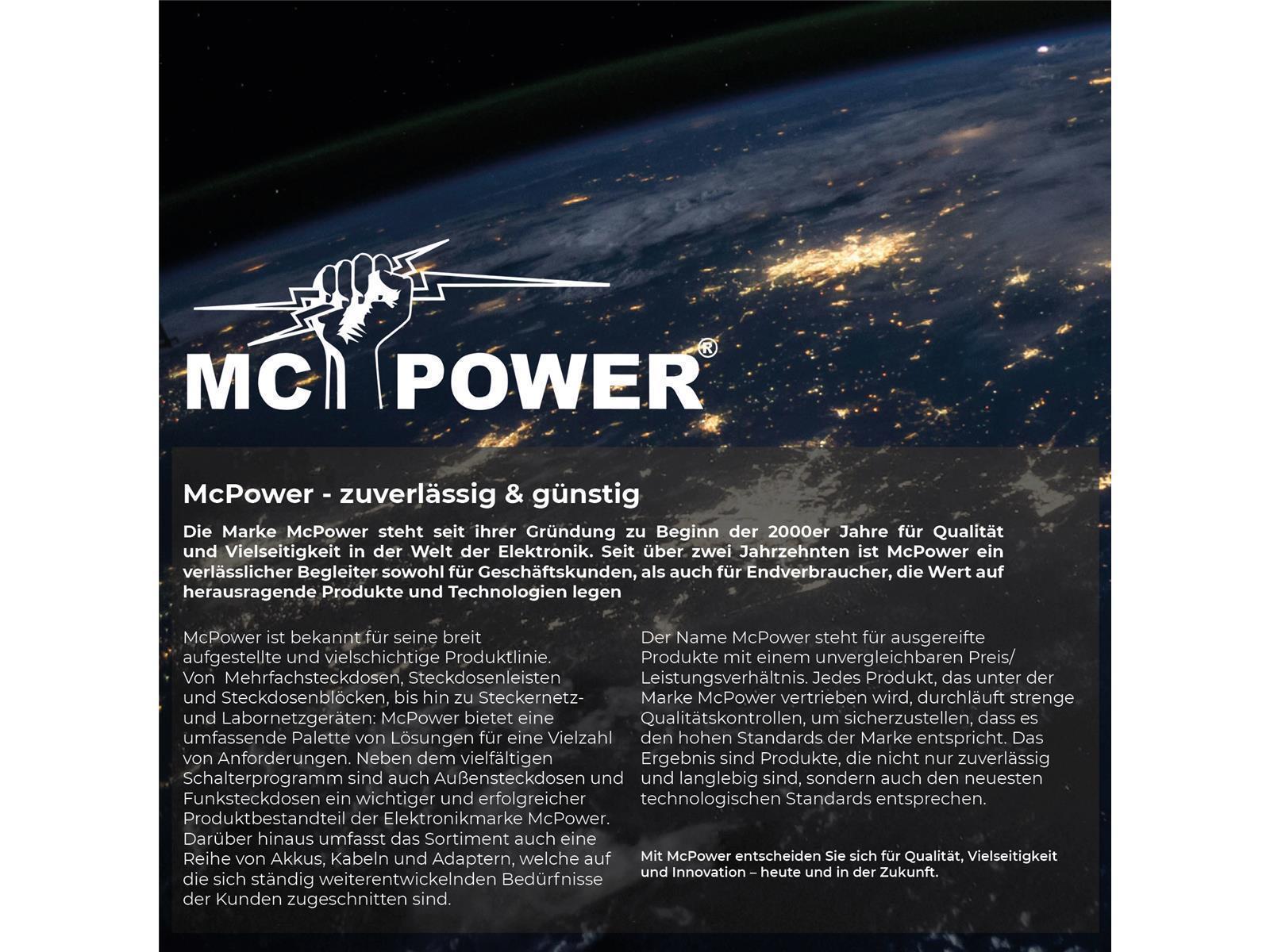 McPower ist bekannt für seine breit aufgestellte und vielschichtige Produktlinie. Von Mehrfachsteckdosen, Steckdosenleisten und Steckdosenblöcken, bis hin zu Steckernetz- und Labornetzgeräten: McPower bietet eine umfassende Palette von Lösungen für eine Vielzahl von Anforderungen. Neben dem vielfältigen Schalterprogramm sind auch Außensteckdosen und Funksteckdosen ein wichtiger und erfolgreicher Produktbestandteil der Elektronikmarke McPower.